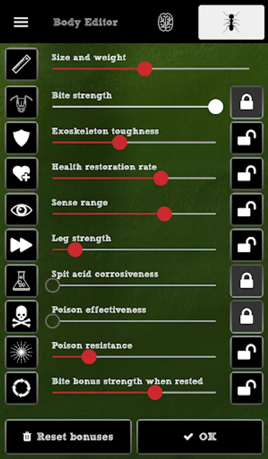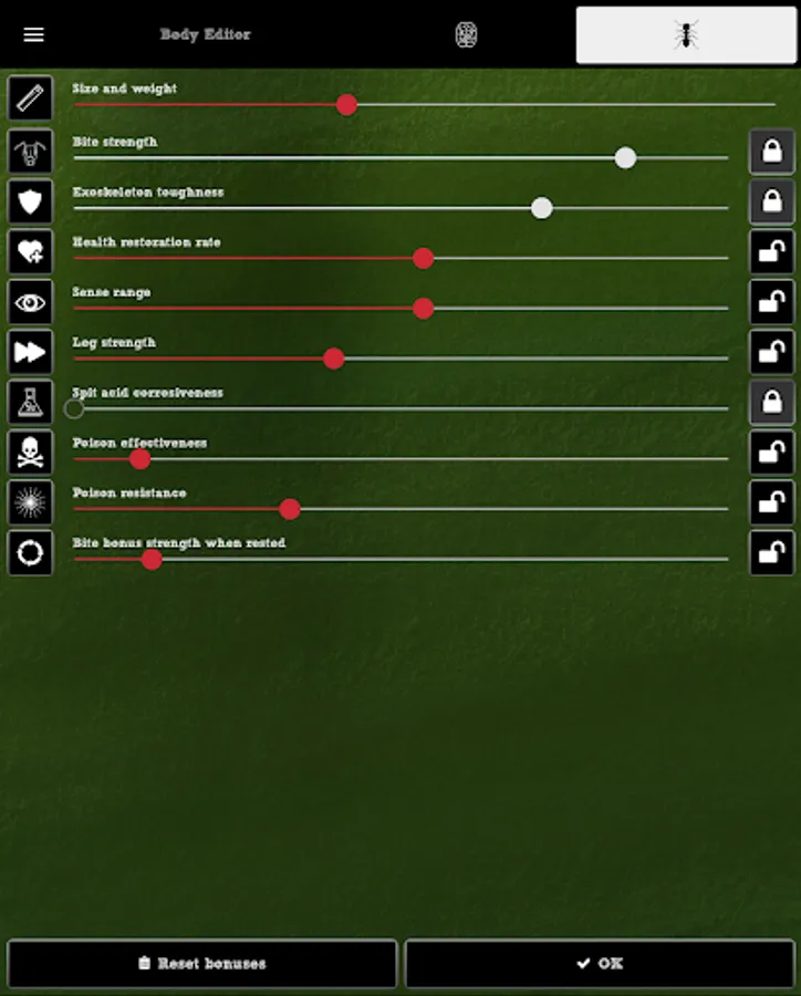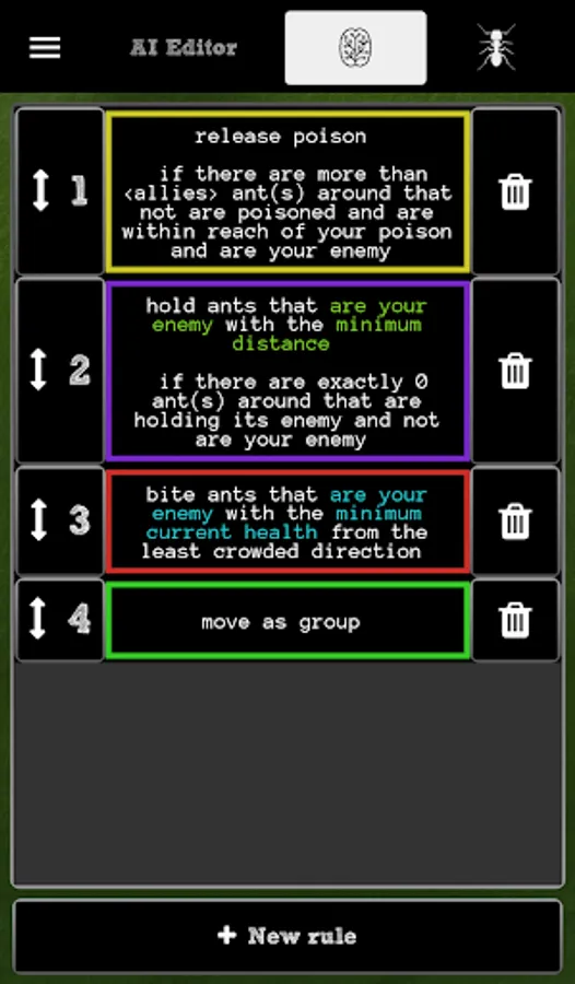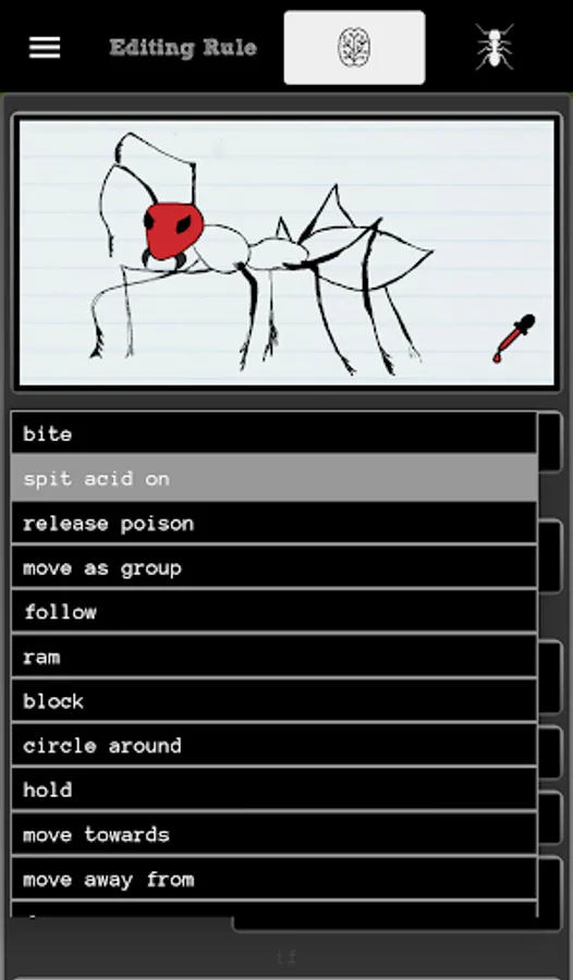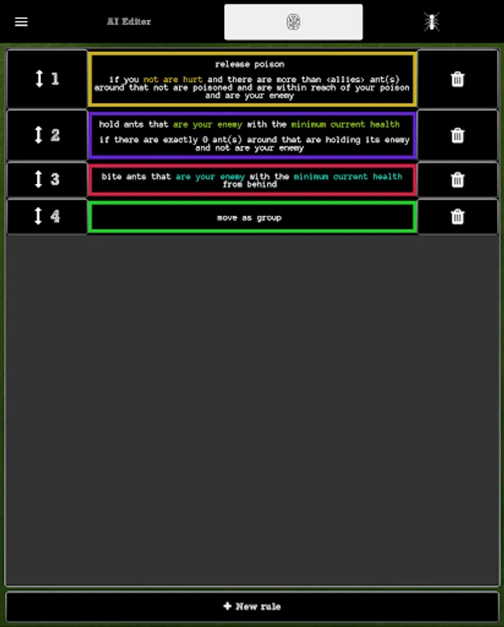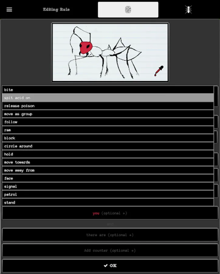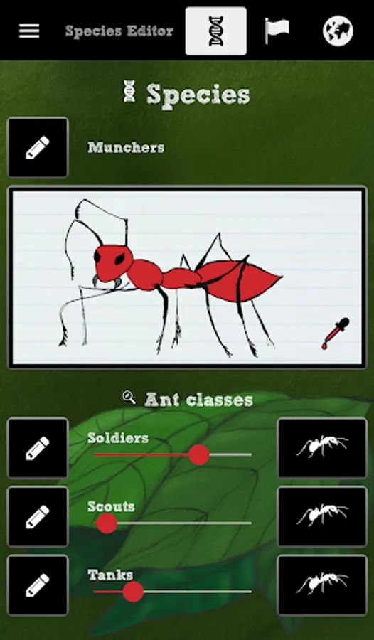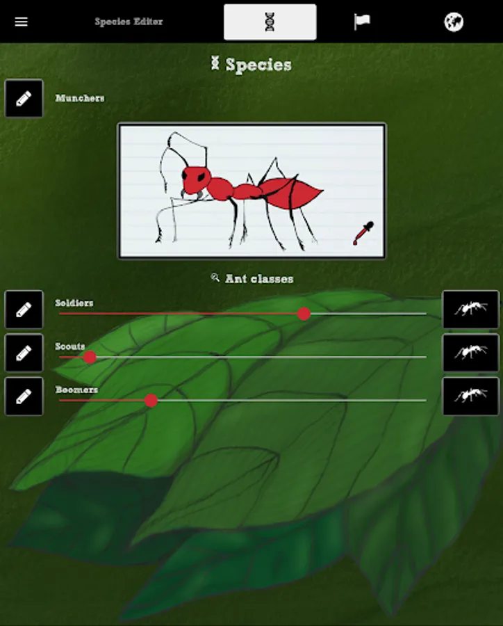 Program the ants behavior, adapt physique and abilities according to your own strategy to beat your opponents on the battlefield. Make use of specialized ant roles - tanks, soldiers, scouts, poisoners or whatever you want to call them, and decide what they should do and look like.