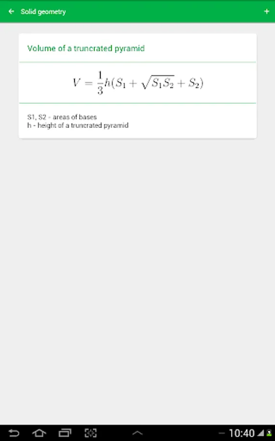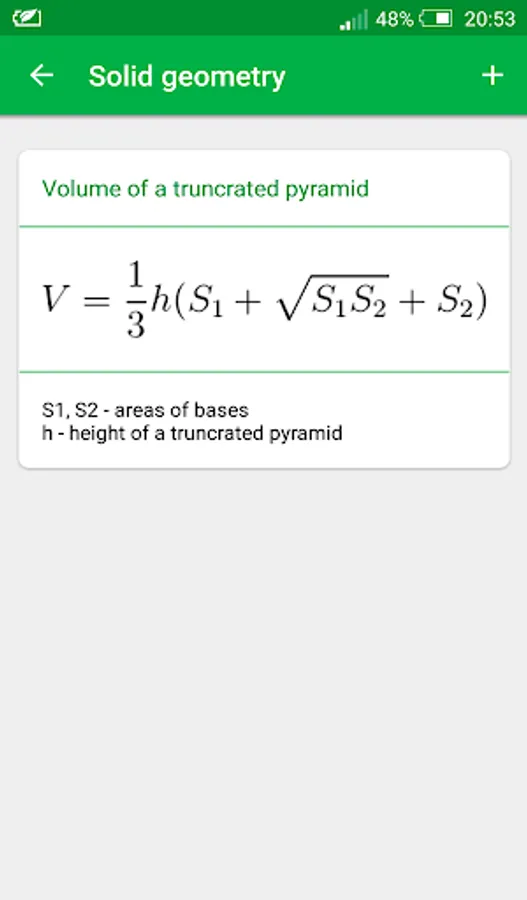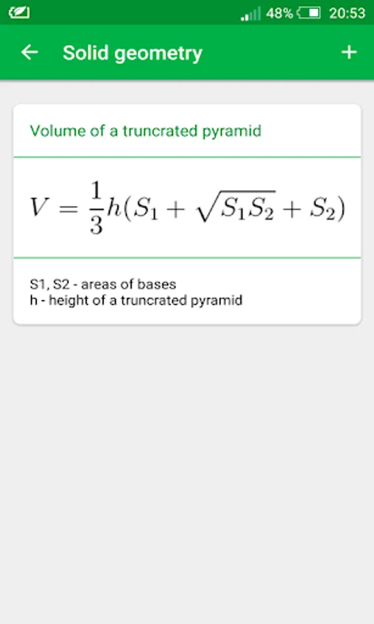 In the app Math Formulas you will find Algebra formulas, Plane geometry formulas, geometry formulas, Solid geometry formulas, trigonometry formulas and much more to help young students to learn this amazing and mysterious science. There is math formulas for all classes.