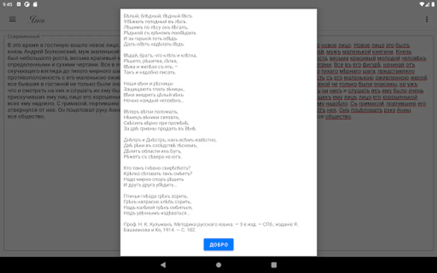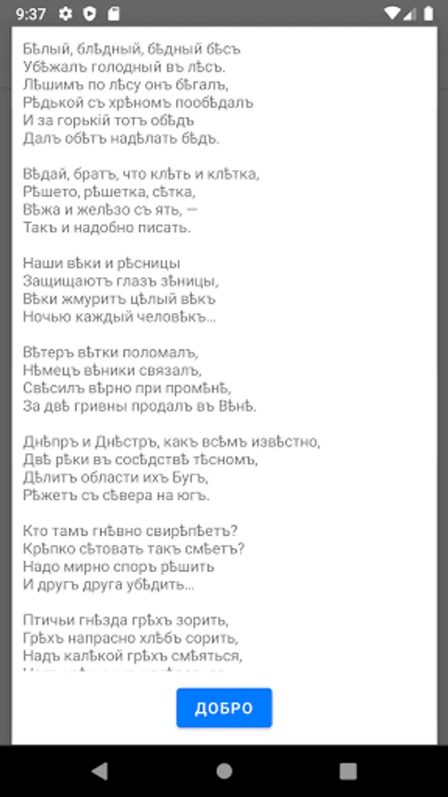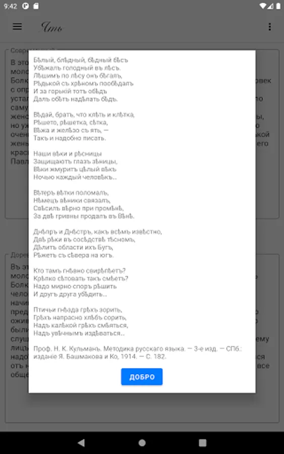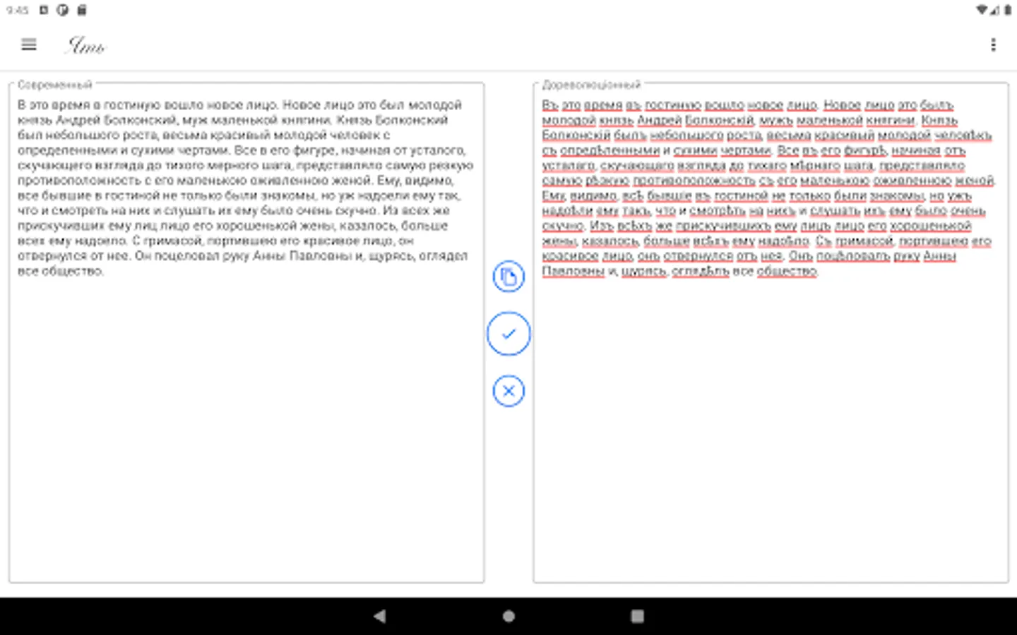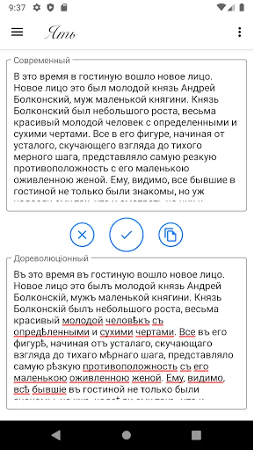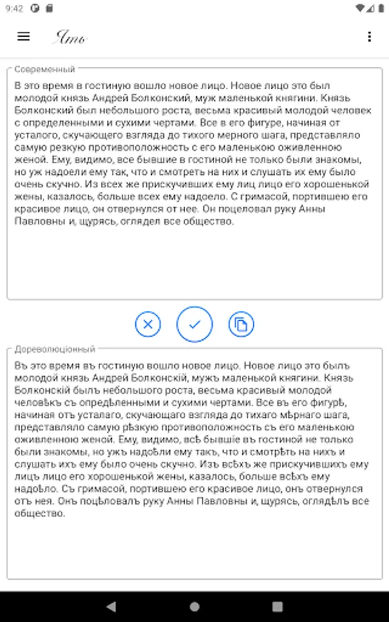 Currently, a significant correspondence to the pre-revolutionary language has been implemented, but still incomplete. If you notice translation errors, then please send incorrectly translated words through the "Report an error" item in the application menu or by email to the email address.