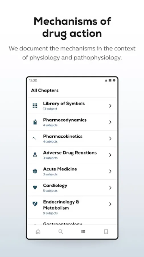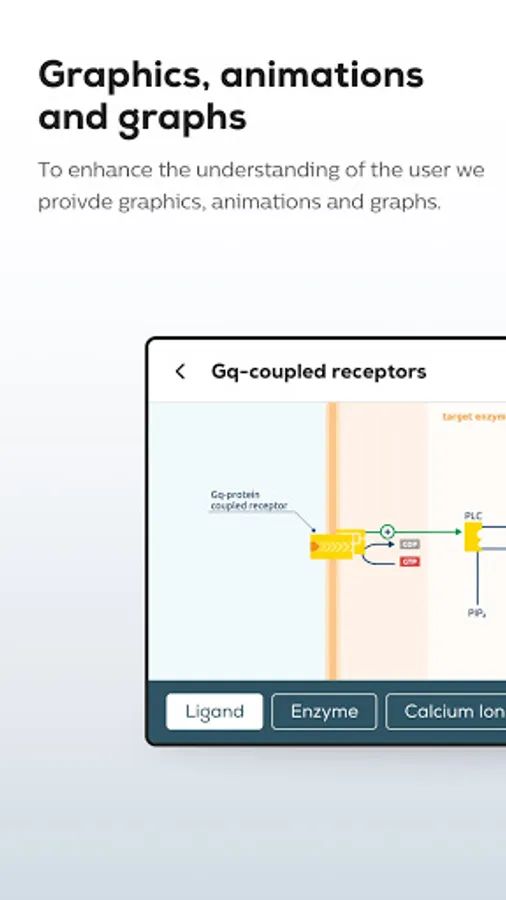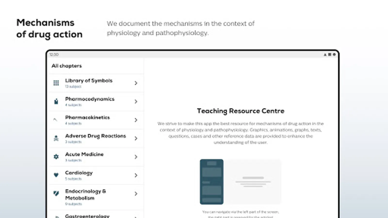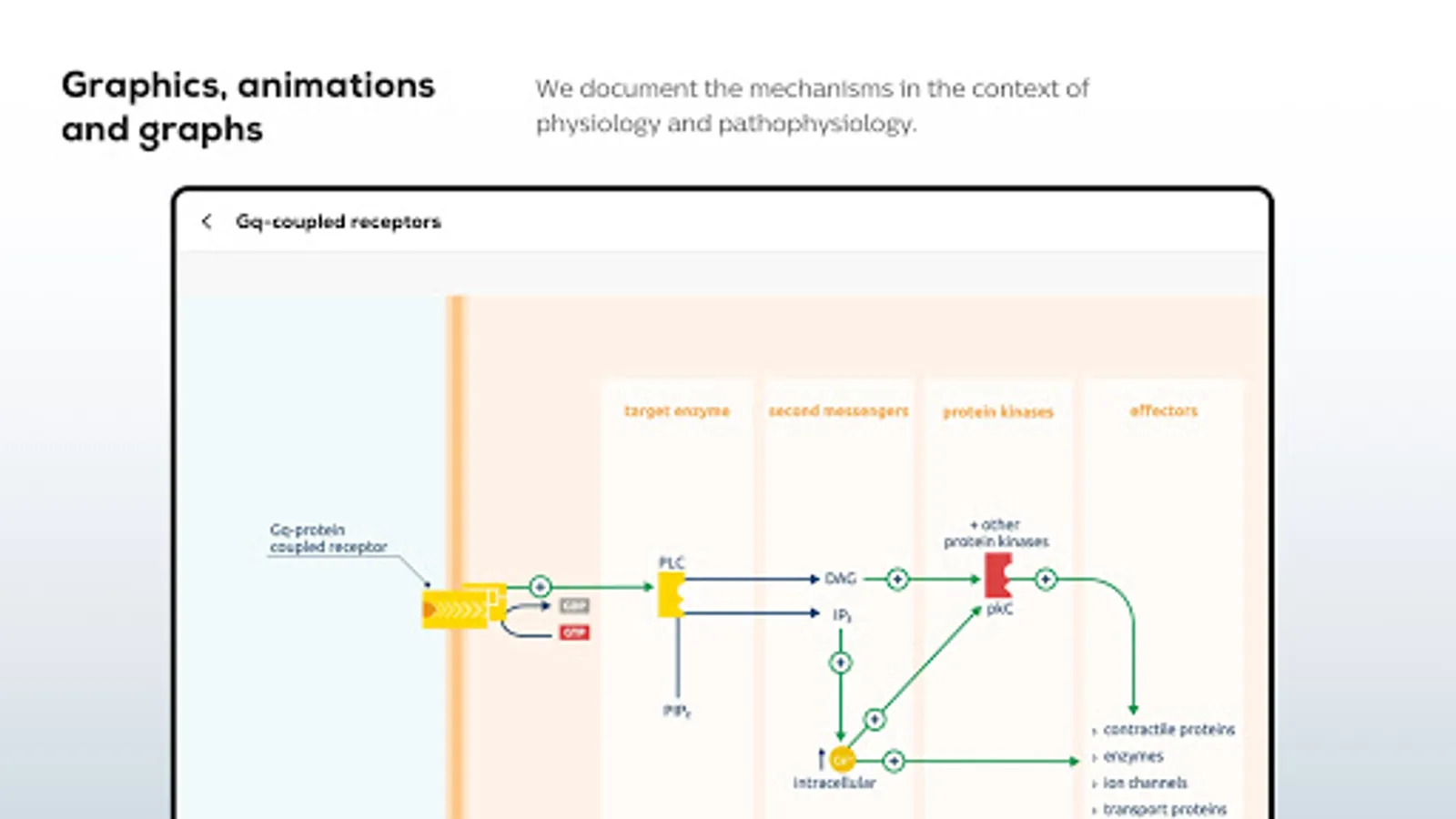 We strive to make this application the best resource for mechanisms of drug action in the context of physiology and pathophysiology by creating each topic in cooperation with an expert from the field. Graphics, texts, questions, and other reference data are provided to enhance the understanding of the user.
