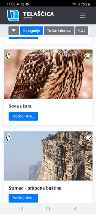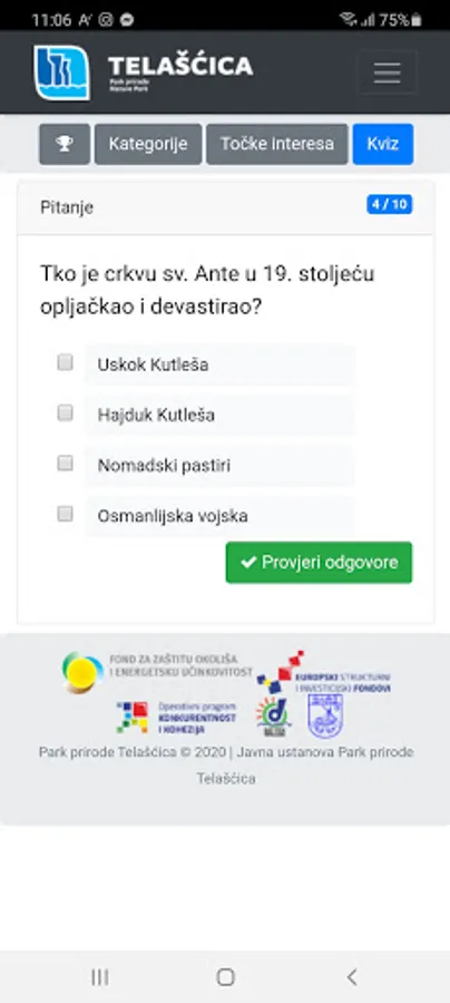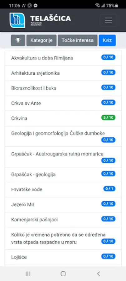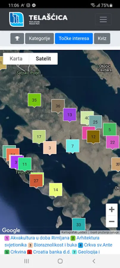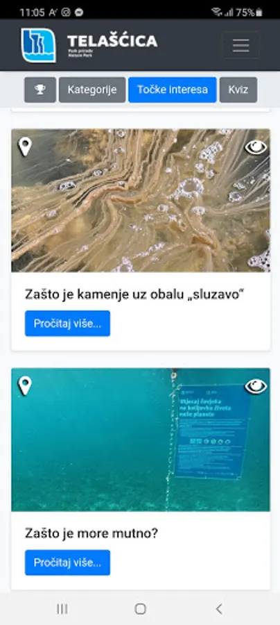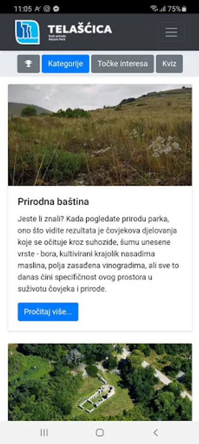 The application allows you to explore the Telašćica Nature Park by going through pictorial and textual materials grouped by categories. Finally, test your knowledge by solving the quiz.
