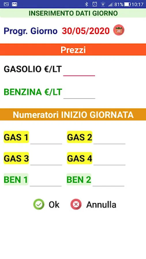 • Enter the daily / shift opening data in terms of column counters and product prices