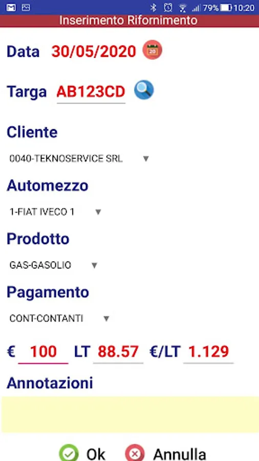 • Enter the data relating to each refueling (for non-occasional customers) very quickly by simply entering the vehicle number plate (which allows the device to automatically select the customer, the payment conditions, the fuel relating to the vehicle and the price current) and the amount.