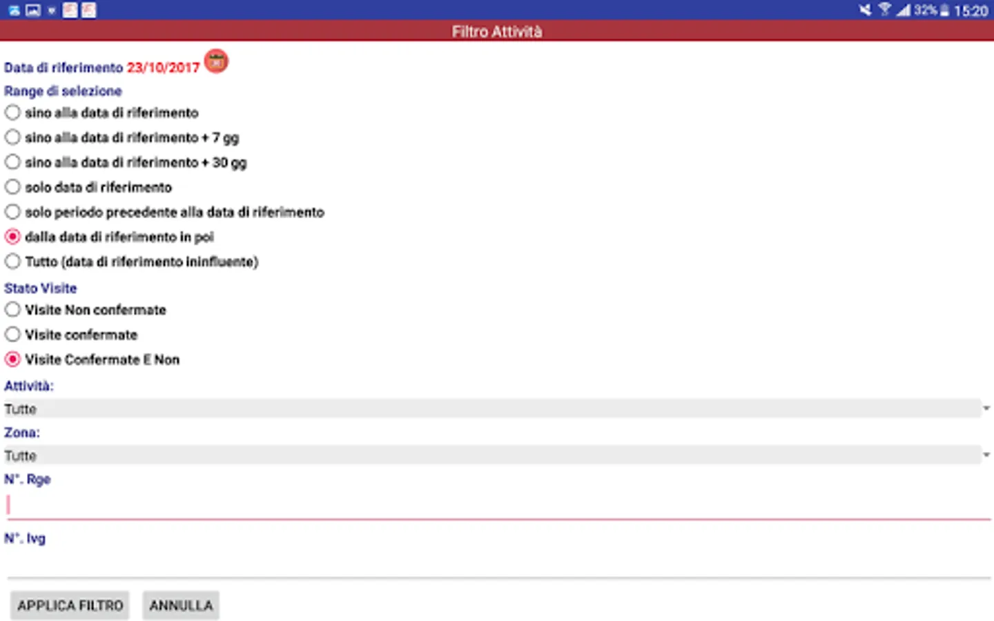• Filter the activities for the period-type-area-nr. RGE-nr.IVG-status request visits