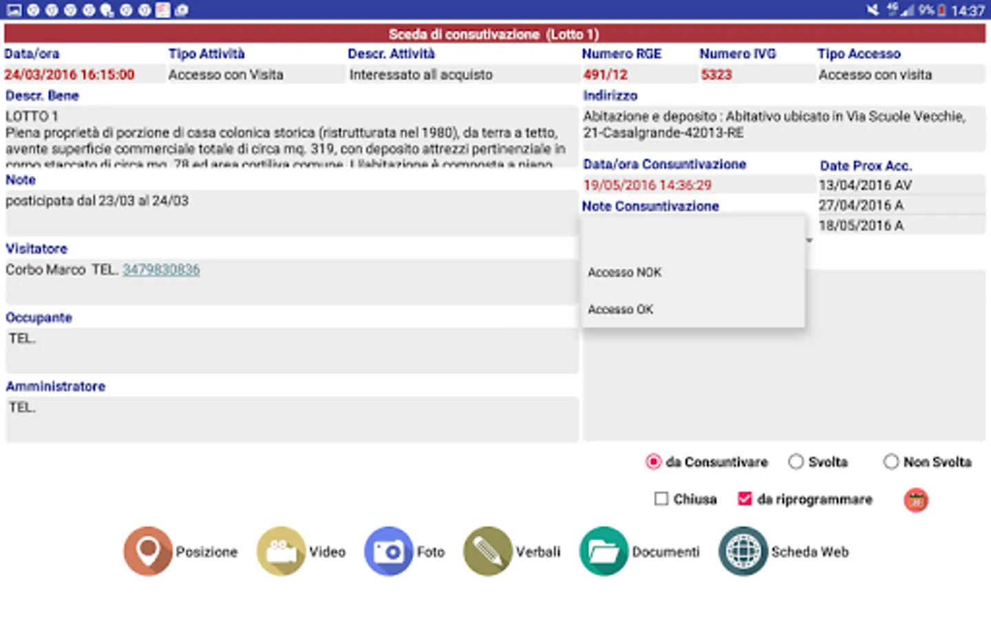 • Consuntivare each custody business with the addition of notes and contextual video / photographic surveys (no limit other than the device memory).