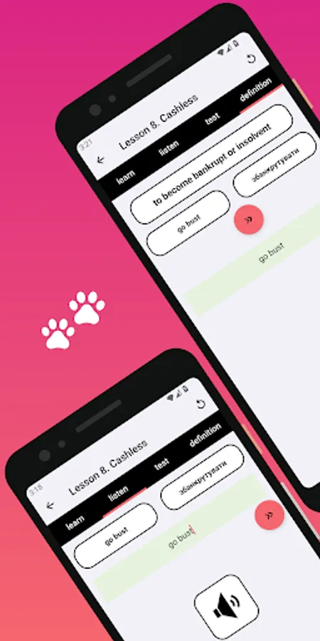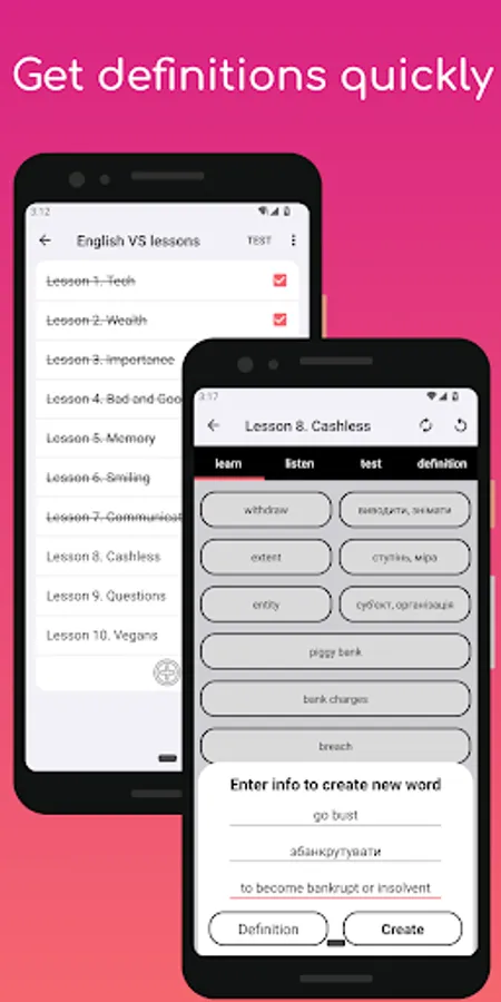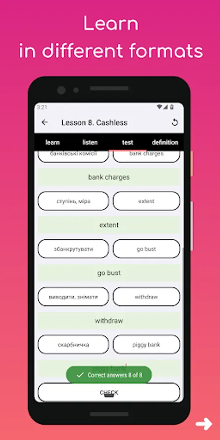 Our app also includes multiple learning formats to suit your needs and preferences. For example, you can listen to a word and then write it, or see only the translation of a word and then write it in English. Additionally, our testing format allows you to see the definition and then write the corresponding English word.