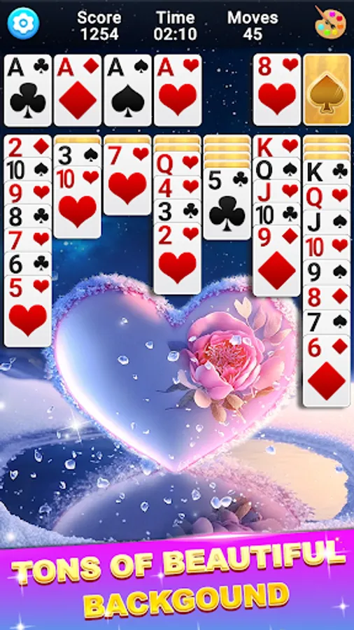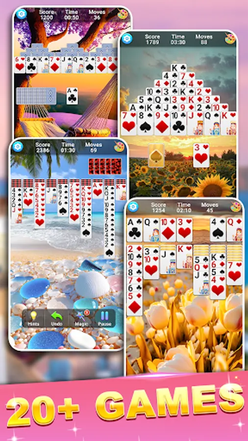 Live tournaments with 1 card or 3 cards(1 suit or 2 suits) options bring you a exciting match. Tournament participants have the same cards with the same order. Multi-player mode supports 2 players and 4 players options. Tournament participants can see opponents' foundations with scores in real time. Participants have up to 3 chances to use magic/hint per game. Player claim magic gifts everyday.