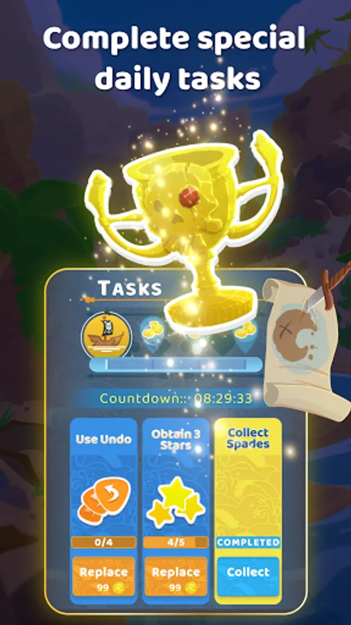 Get aboard this adventure, sail through a sea of challenges and discover all the treasures you can get as you progress in the game. Complete special tasks, win levels consecutively, or snatch all the treasures from Pirate Bay to gather boosts and coins that will help you unlock and solve the most challenging levels.