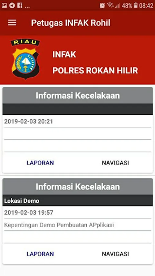 This application is an integral part of the ILINK Rohil application which reports from community members. so this application is devoted to the application for police officers of the Rokan Hilir Police which functions to respond to accident reports from residents of the community so that fast action for accident handling is quickly resolved