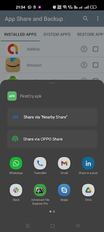 *Share selected or all apps via Email , Whatsapp , Bluetooth , Facebook , Google Drive , DropBox , Slack and other platforms.