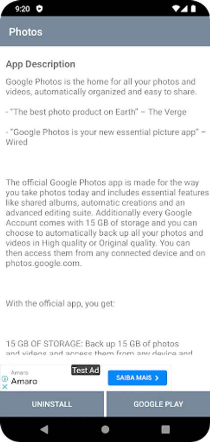 * Description and permission details of each app