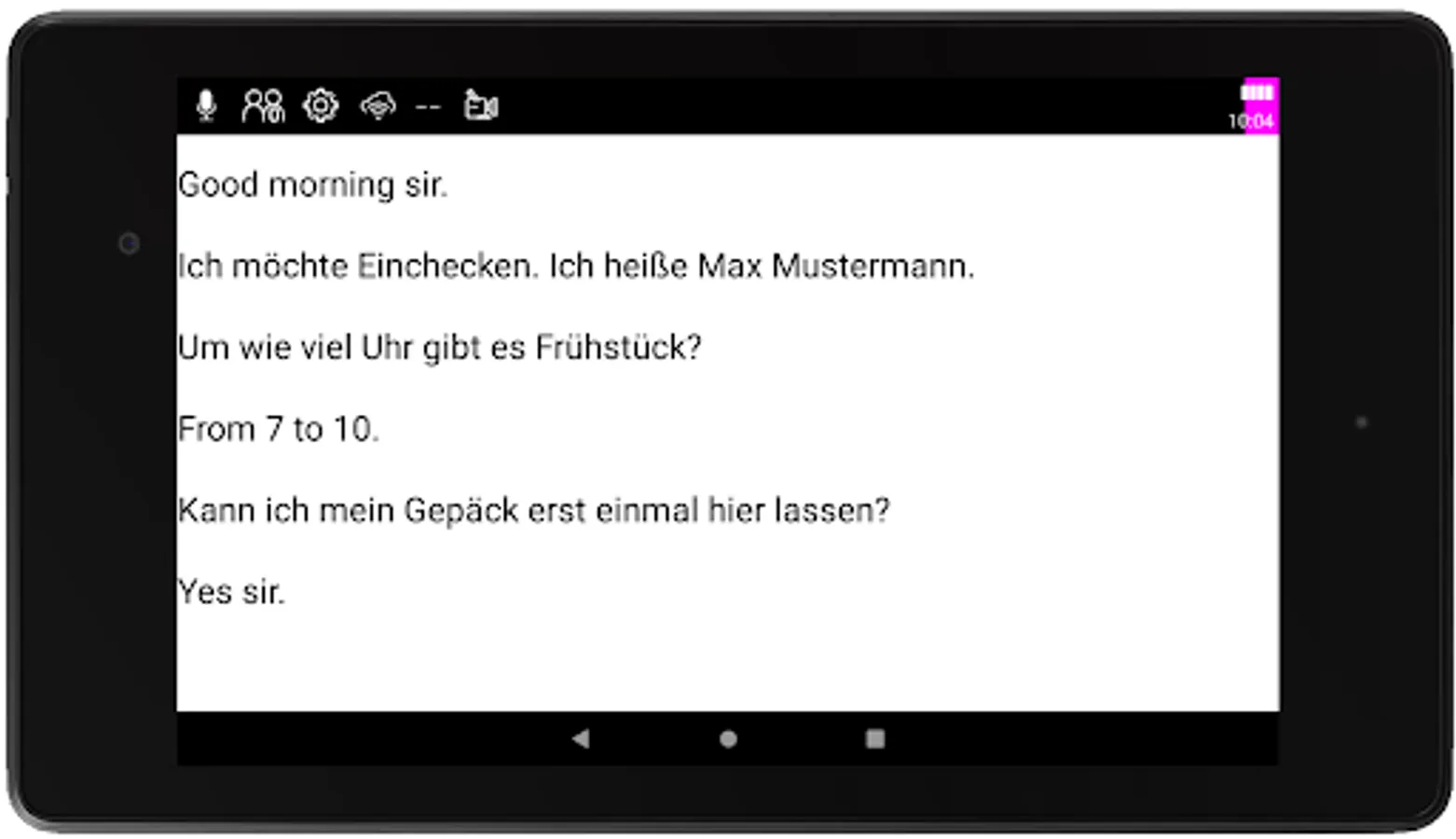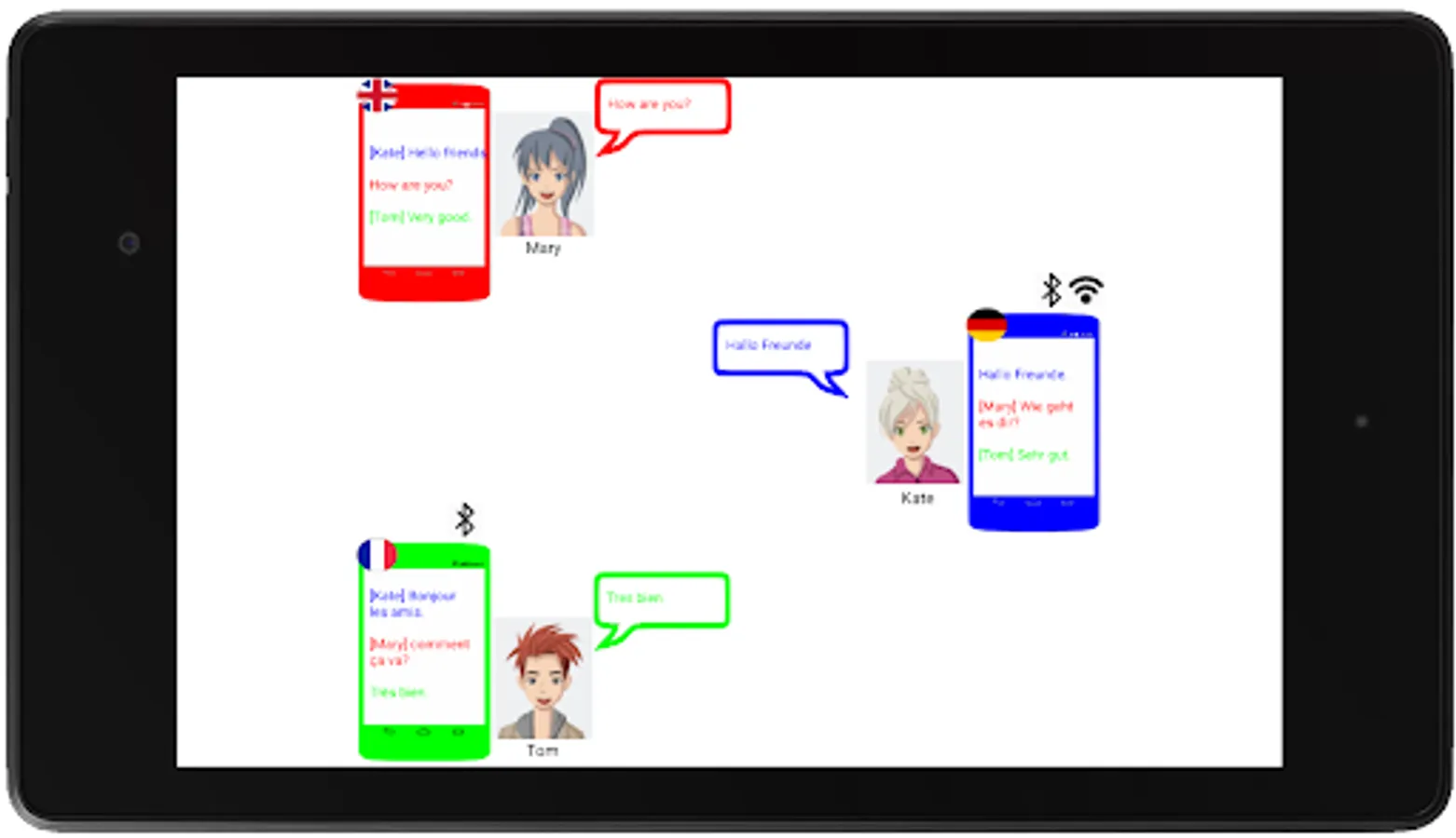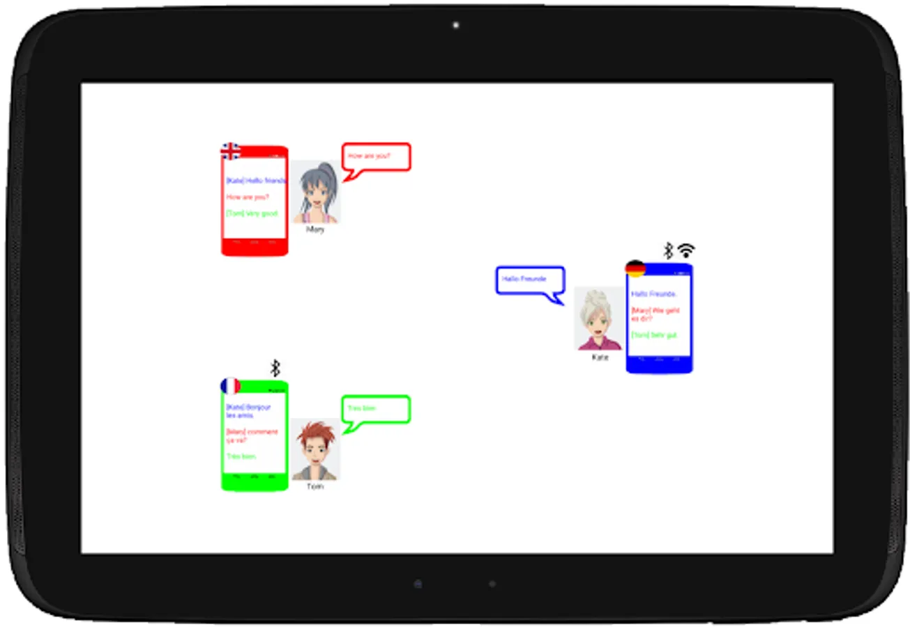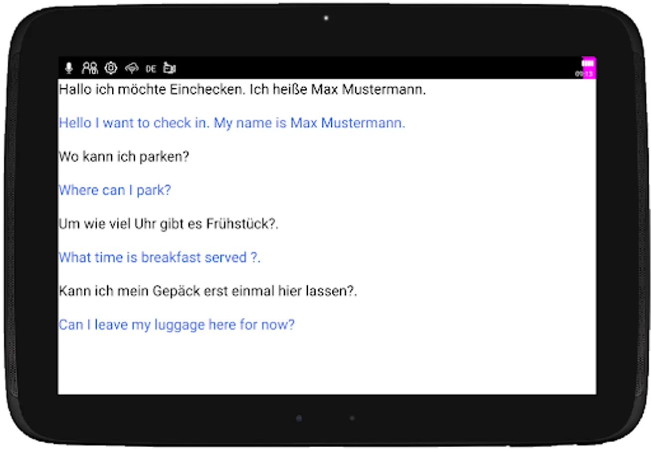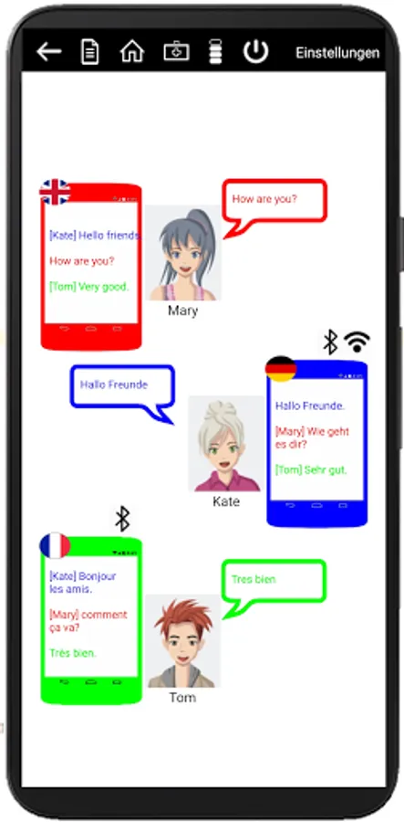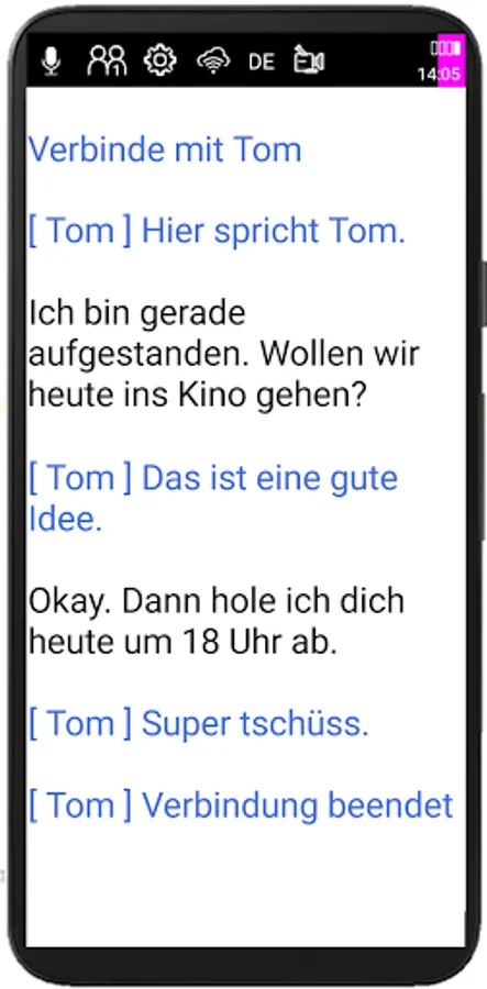 Example: You speak German "I'm fine". The text "I'm fine" will appear on your device. Your conversation partner (Tom) reads "I feel good" and replies "Me too", then the text "[Tom] Me too" appears on your mobile phone/tablet.