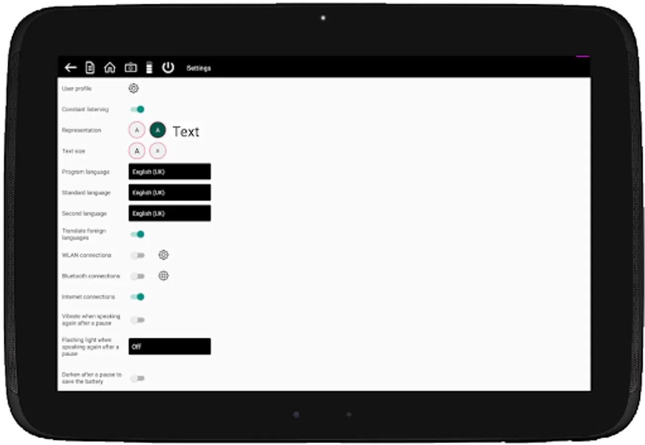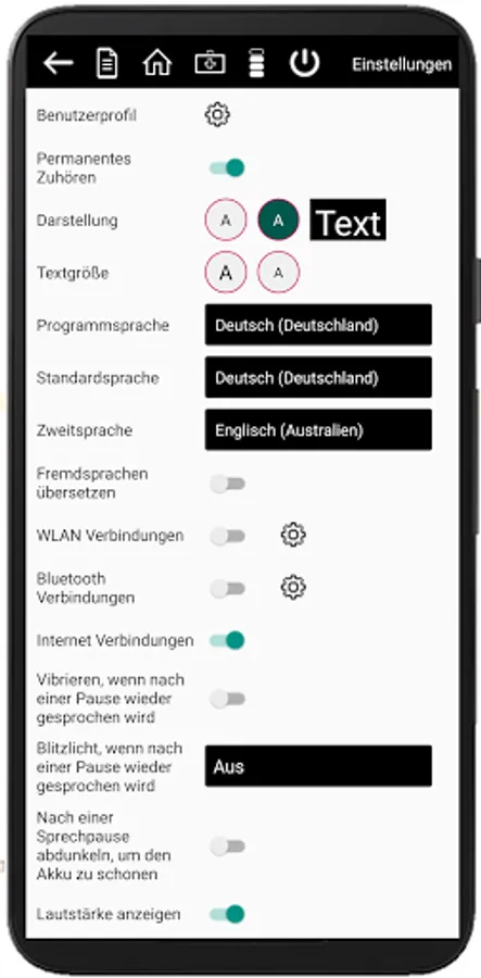 The app was specially optimized for this group of users and contains various functions that significantly improve the communication options for the hearing-impaired. These include e.g. the functions "vibrate on call", "flash light on call", "volume display", setting individual font size and background color. Optional are indications of the end of pauses in speaking. You can be alerted to the beginning of a new speech phase by vibration and optical signals (flashlight behind/in front or short "flickering" of the text window.