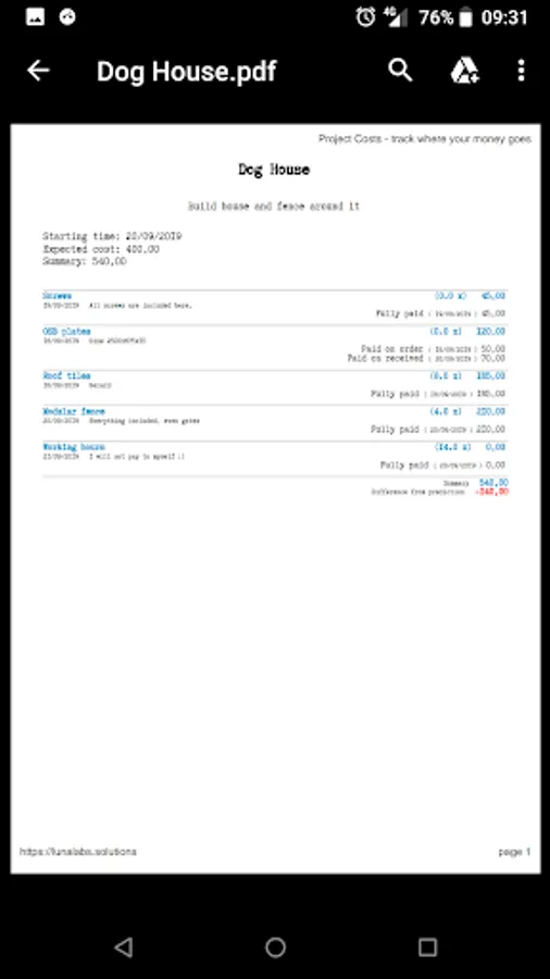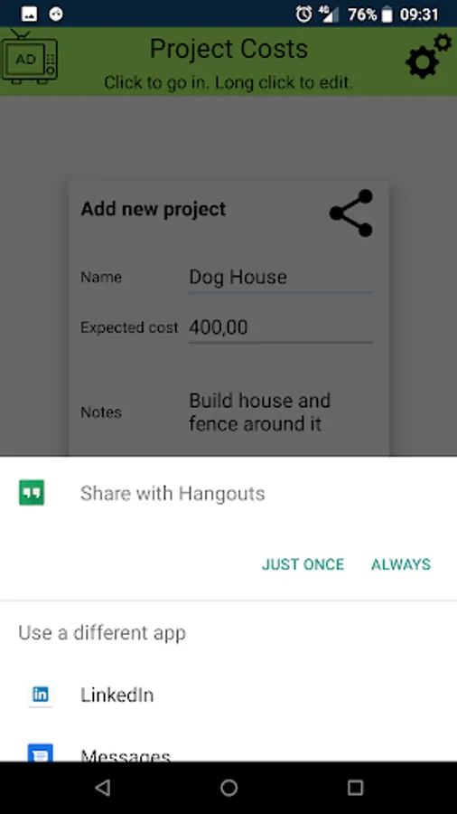 Do you want to share only one project in Project Costs app? No problem. Long click on project and share it. App will generate URL that you can send to your friends. Whoever click on that URL can see this project on it's device in a matter of seconds.