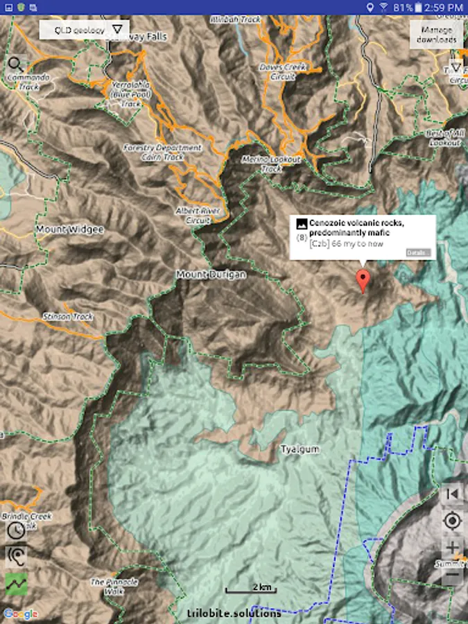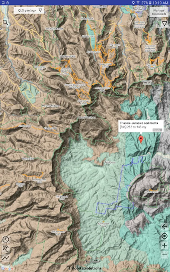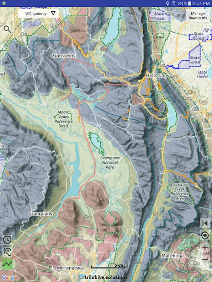 Australian Geology Travel Maps is a field app that displays the best available data from the government geological surveys in interactive maps created by Trilobite Solutions. It does not have any reliance on cell phone reception in the field, and uses GPS so your location is always marked on the map. Maps are downloaded to your phone when have an internet connection, and from that point on, you are independent of the internet.