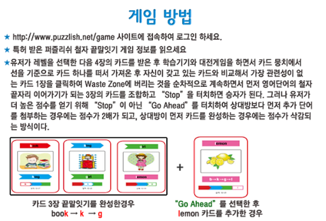3) Improve the game characteristics to stimulate the users' victory and achievement, so that they can learn continuously. Completion of the English word completion card will increase the score, and score will be reduced if the opponent wins. English Sentence A time control system that can control the speed of the game.