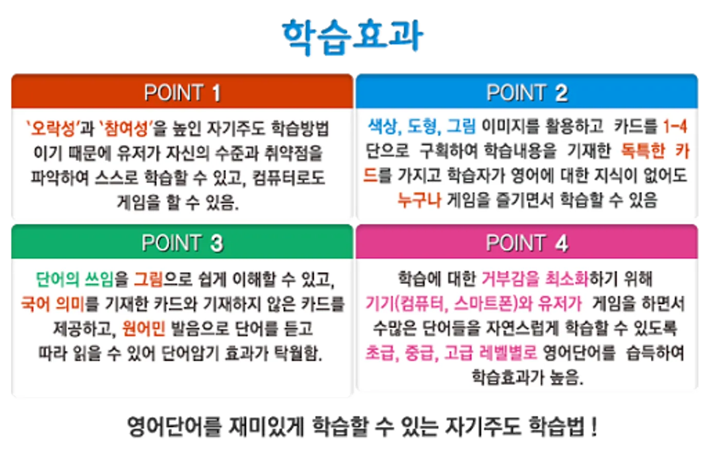 Even if you do not have a basic knowledge of English words, you can select the items that fit your level by providing hints on unique cards that are divided into 1-4 levels based on cognitive linguistics. You can master from beginner to advanced word with fun while understanding the picture and listening to native speaker pronunciation.