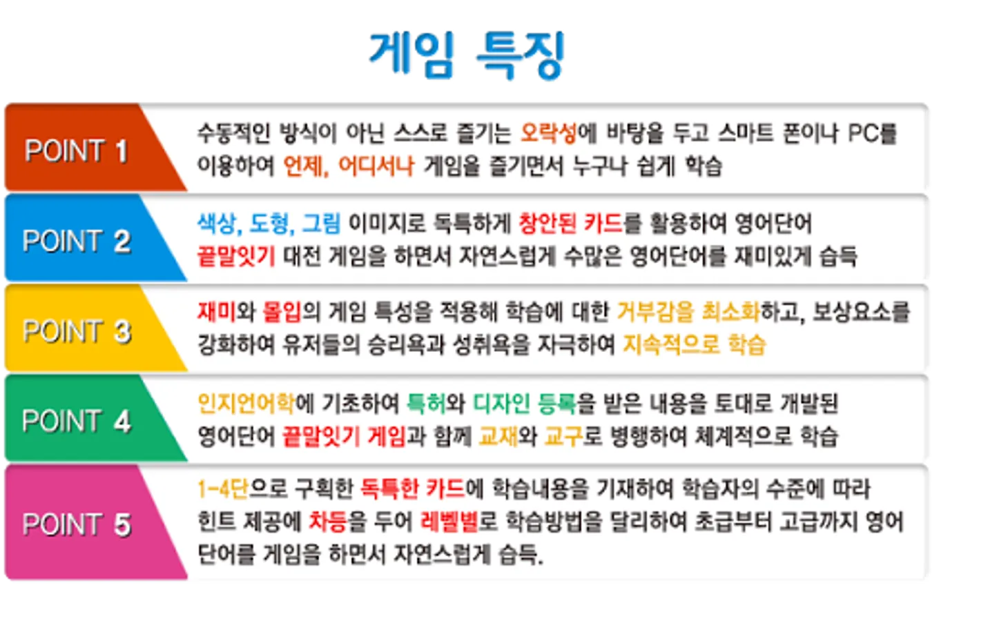 4) A self-directed learning method that allows the learners to learn according to their own level, with different levels of word level and hinting for each level of the game.