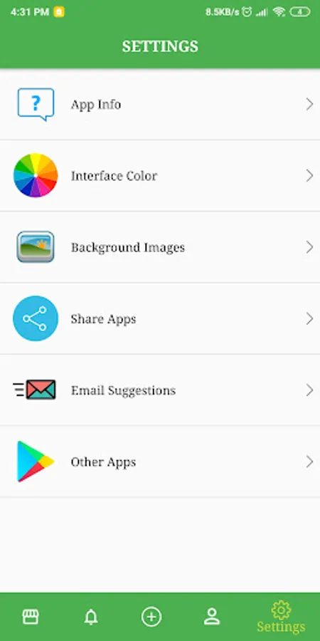 + Settings item: allows you to change the interface color, view application information, send email suggestions, ...