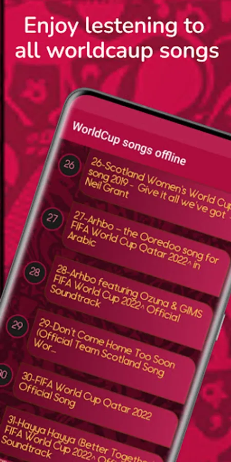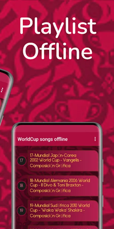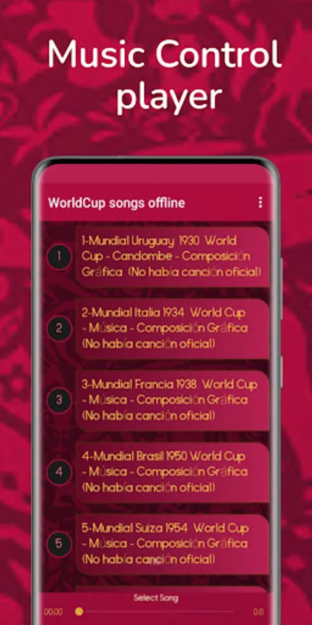 Listen to all World Cup songs from 1930 to 2022 to experience the history of the Mundial. All songs are accessible offline.