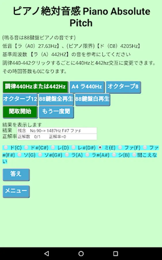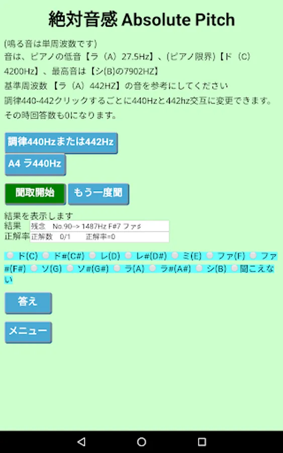 You can check the absolute pitch as if playing a game. You can also hear or tick frequencies from about 20Hz to 22000Hz. You can also check with a piano sound because some people have a hard time hearing a single frequency. The piano can tune the standard tone A=440Hz and 442Hz. If you have a sense of pitch, please give it a try.