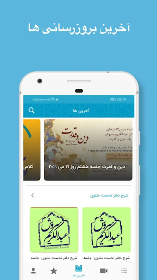 Features such as viewing some of the lectures online, asking questions with Dr. Soroush and loading thematic quotes are also foreseen in this app.