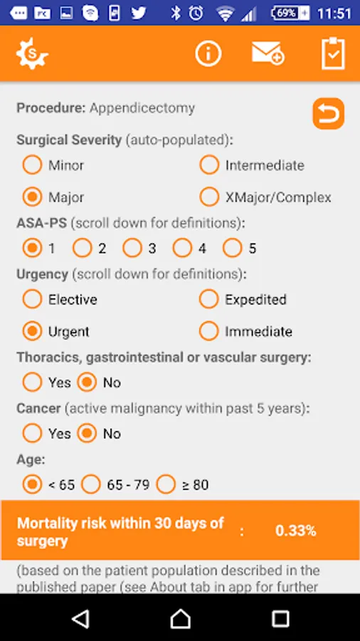 The SORT is a FREE preoperative risk prediction tool that provides a percentage risk for mortality within 30 days of surgery. Developed and validated on a UK adult patient population (aged 16 or over) who had surgery as part of an inpatient stay. Exclusions: obstetrics, neurosurgery, cardiac, and transplant surgery.