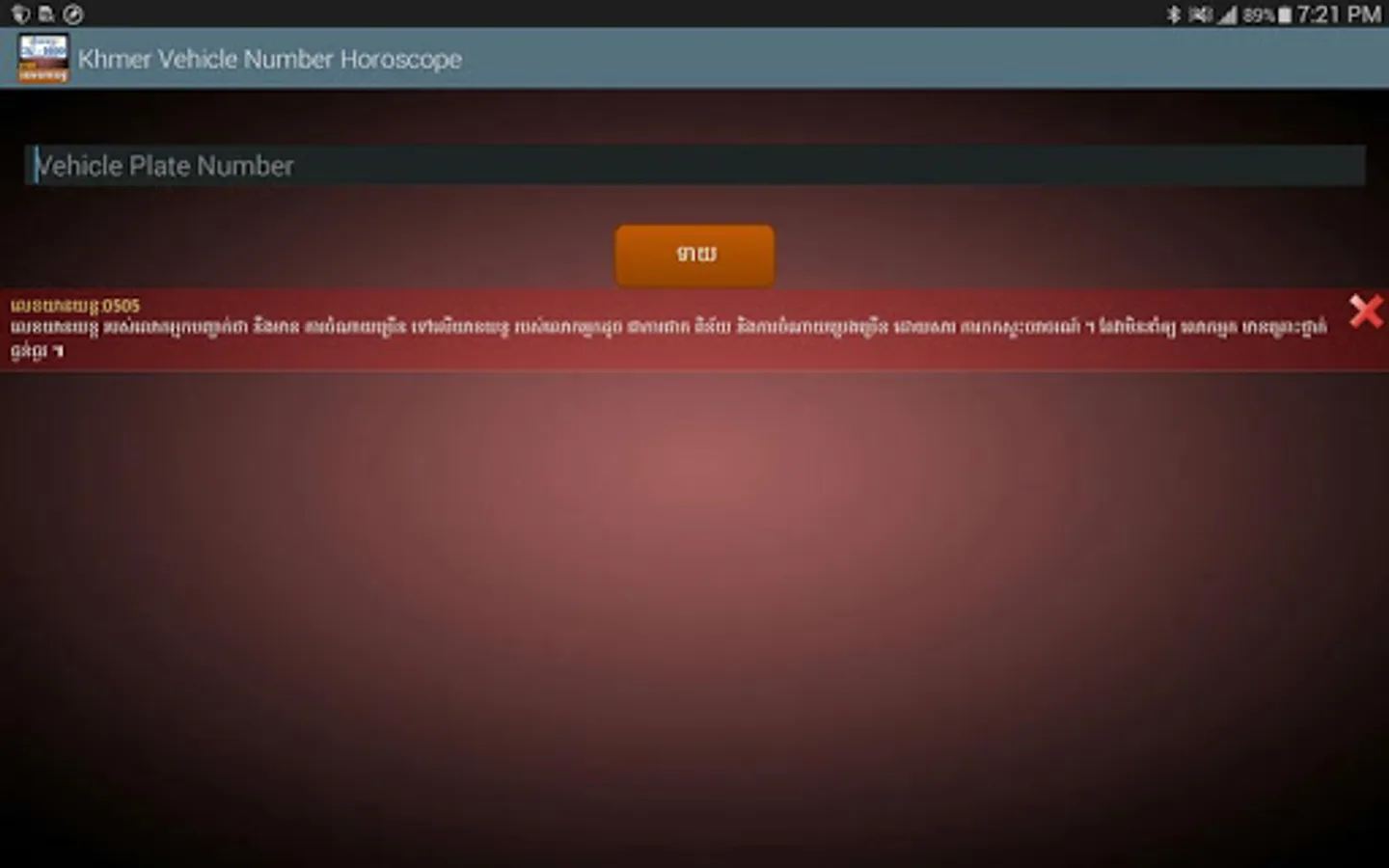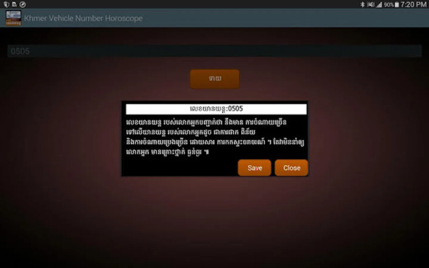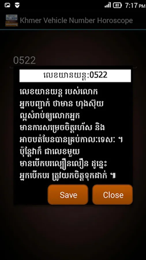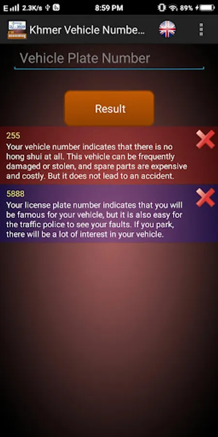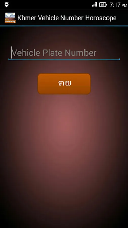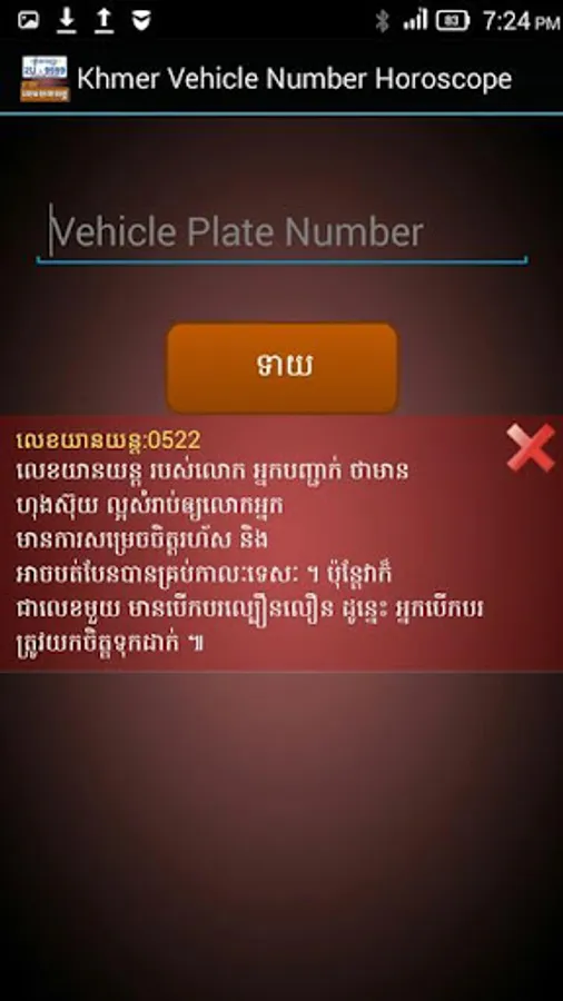 This application allows you to check out your vehicle plate number whether it is best luck for you or not. More interestingly, it allows you to save your checked number up to 5. So that you don't need to repeating checking or typing up the same number again. The result will come up in English or Khmer language.
