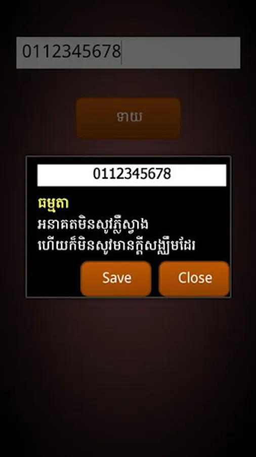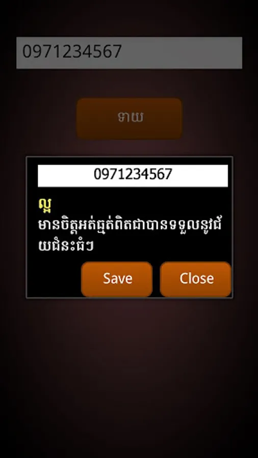 This application allows you to check out your telephone number whether it is best luck for you or not. More interestingly, it allows you to save your checked number up to 5. So that you don't need to repeating checking or typing up the same number again. The result will come up in Khmer language.