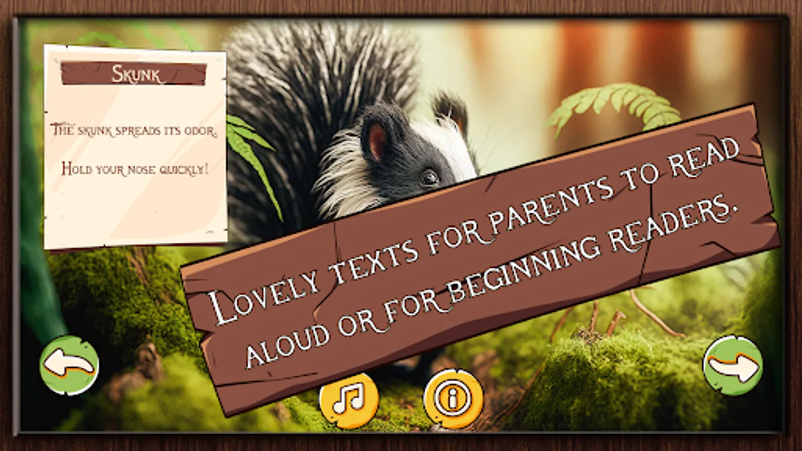The game for toddlers shows lovingly designed pictures of animals. A sound can be played for each animal. Beautiful forest sounds accompany the scenery. In addition to the possibility of playing the animal voices, there is a short text for each picture that can be read aloud by the parents and encourages interactivity. The short texts are also suitable for reading beginners to practise reading.