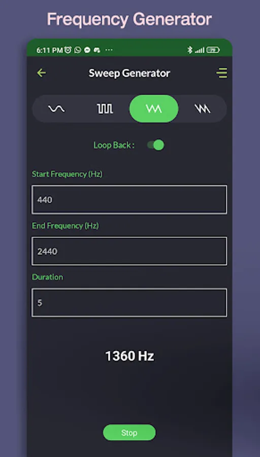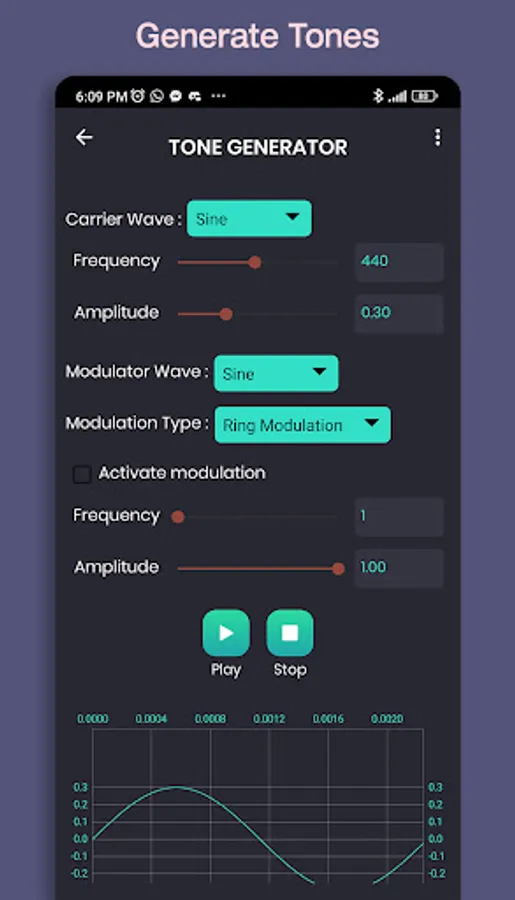 The Tone Generator feature in the app works like a Frequency Sound Generator, generating sounds in different frequencies, such as sine, square, sawtooth or triangle sound waves with a frequency between 1Hz and 22000Hz. This feature can create a high variety of sounds and signals and change the sound signals.