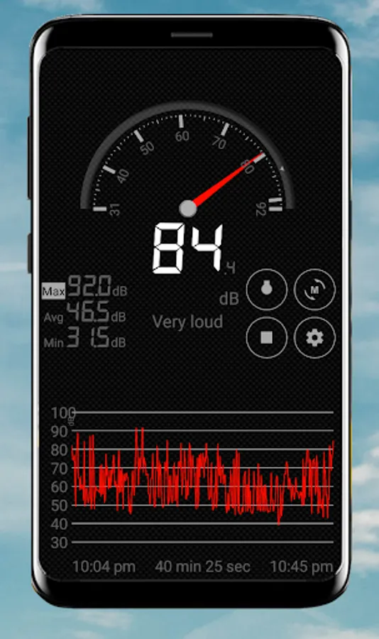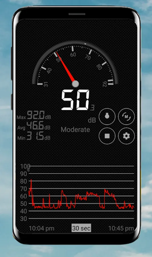 Toggle between four modes to see the maximum, minimum, average and 30-second trail decibel values for different sound measuring applications.
