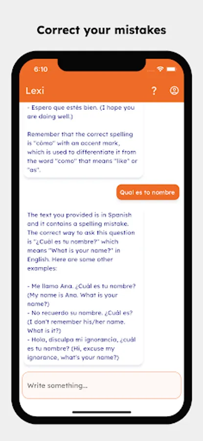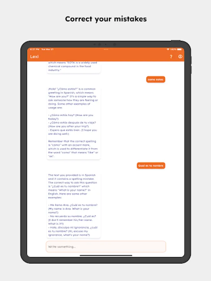 1. Corrections: Eliminate grammar mistakes and mispronunciations with Lexi's advanced AI language correction feature. Get real-time feedback on your written and spoken communication, ensuring you improve your language skills effectively. For example, if you write "She don't like apples," Lexi will correct it to "She doesn't like apples."