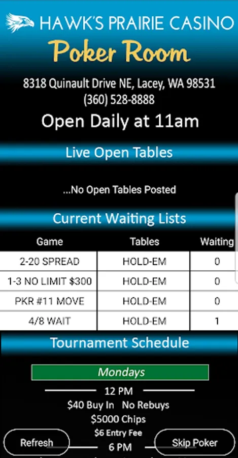 Use the Hawks Prairie Casino App to see which poker games are live and what waiting lists are available. View the poker tournament schedule, see current and upcoming food specials and find out the latest table game jackpot amounts!