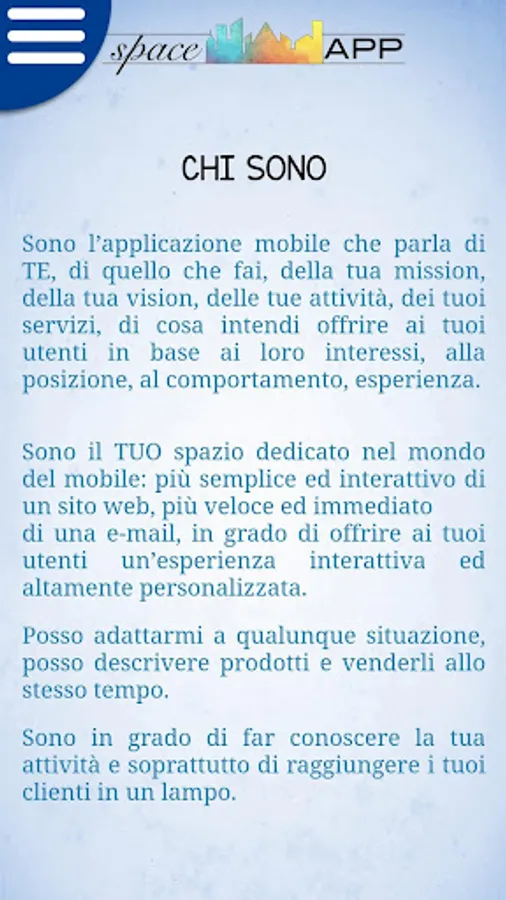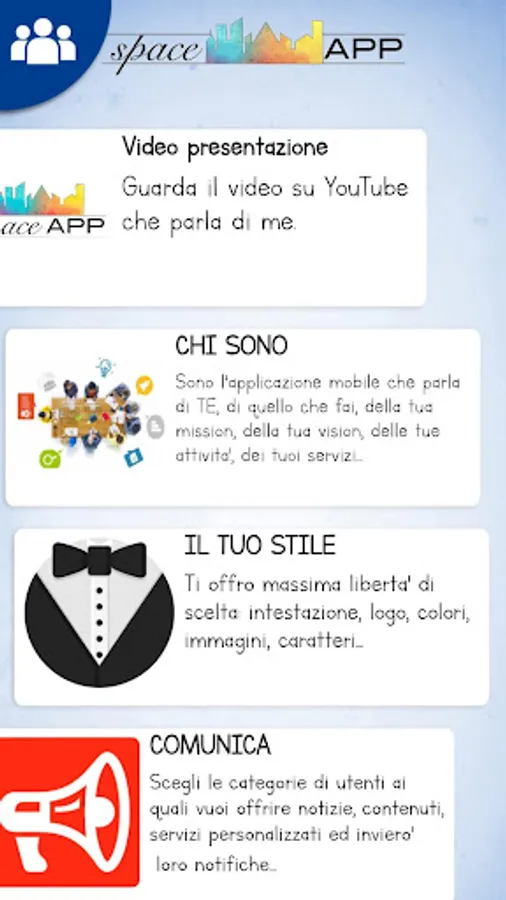 SpaceApp is the mobile application that talks about your company, your body, your organization, your project in a simpler and more interactive way than a website, faster and more immediate than an e-mail, able to offer users smart an interactive and highly personalized experience. It is a modern and intuitive communication tool to make your mission, your vision known, describe your activities, your services, show what you intend to offer your users based on their interests, position, behavior, experience.