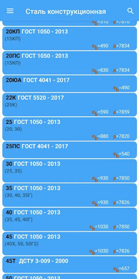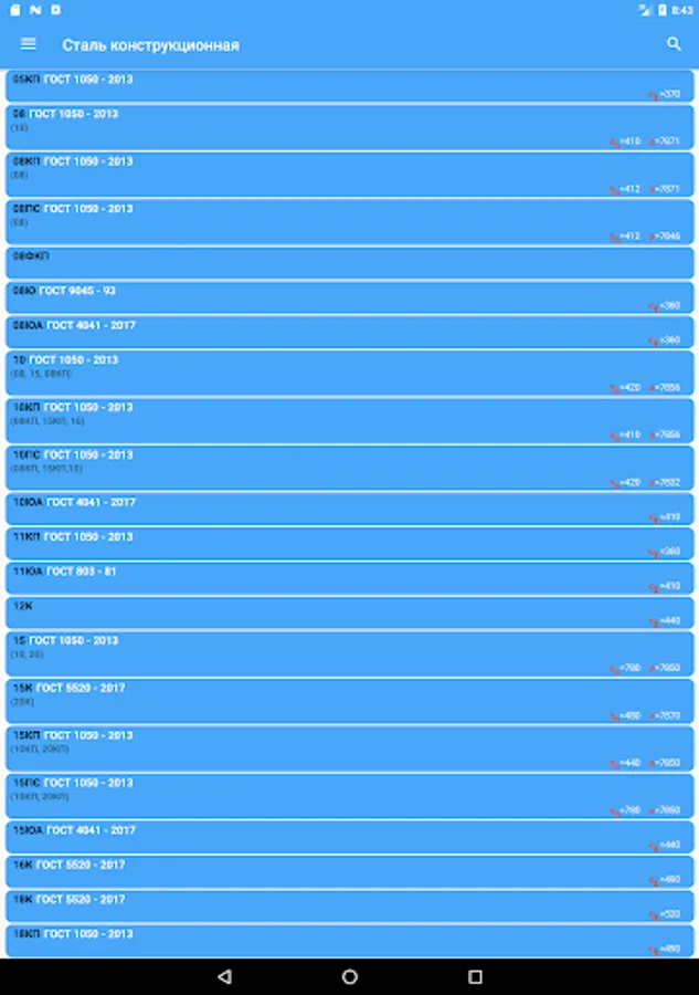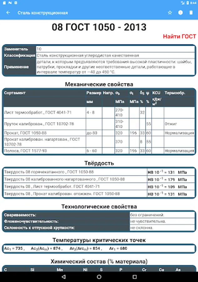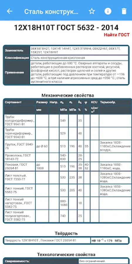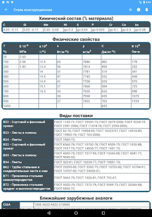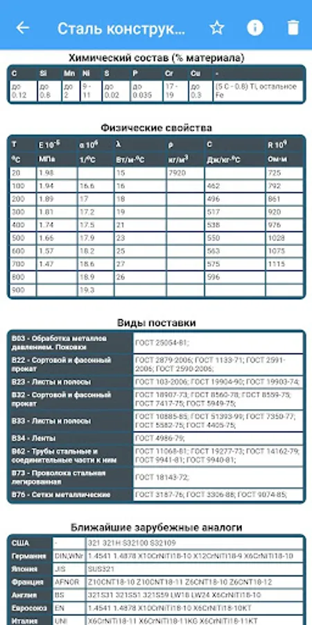 Reference contains properties for 3300 steels, alloys and metals and links to GOST. All steels and alloys are stored on the device and are accessible without internet access.