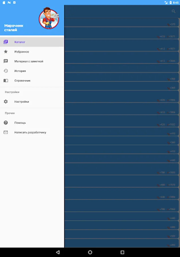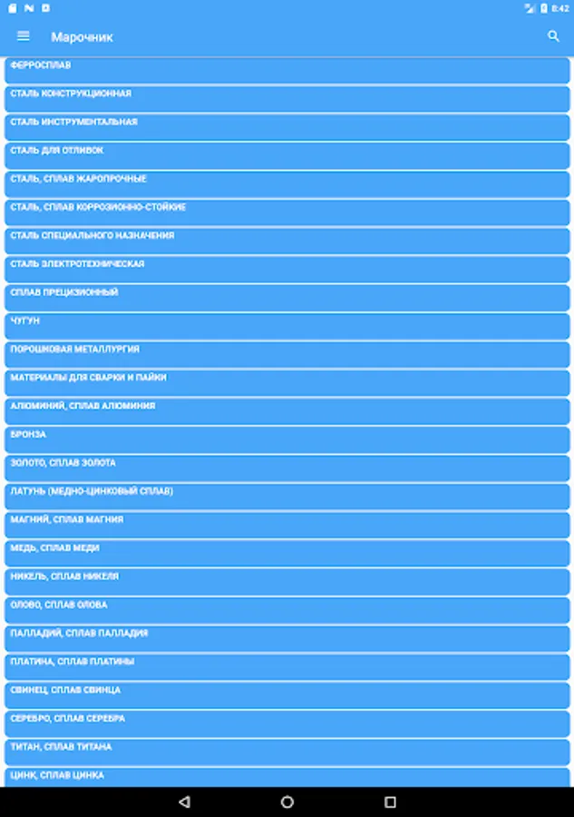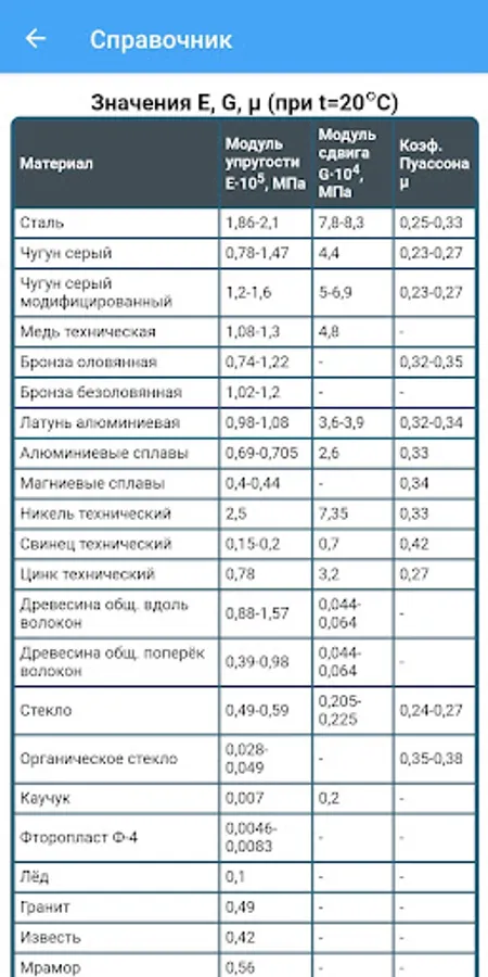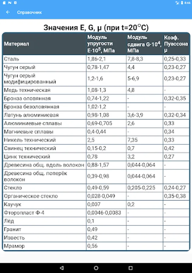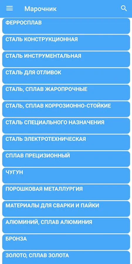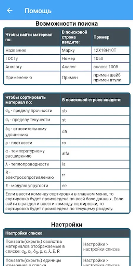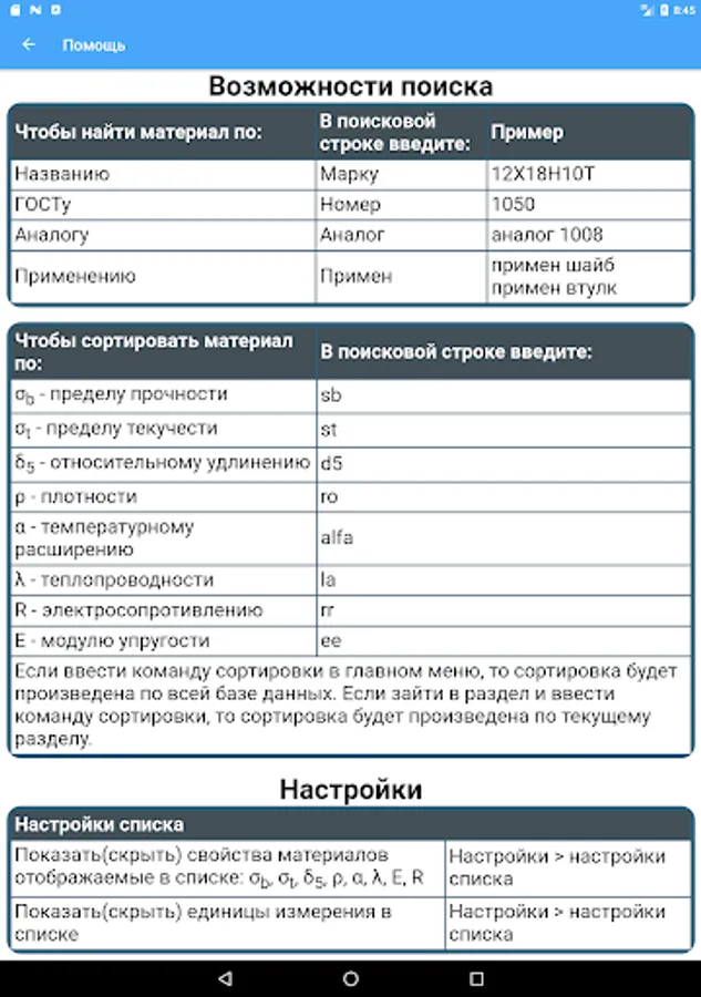 Reference contains properties for 3300 steels, alloys and metals and links to GOST. All steels and alloys are stored on the device and are accessible without internet access.
