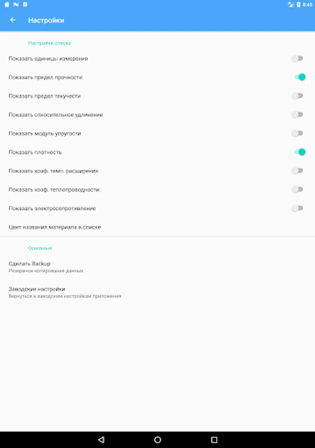 The list of steels and alloys displays: grade, GOST, substitute, tensile strength and yield strength, density, elongation, elastic modulus, thermal expansion coefficient, thermal conductivity, electrical resistance. In the settings, you can select the desired properties that will be displayed in the list (by default, the tensile strength and density are displayed).