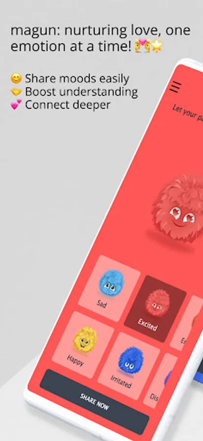 Introducing magun, your delightful mood-sharing buddy for couples! 🥰 magun is designed to bring you and your loved one closer by sharing and communicating your moods with ease. With our app, you'll experience improved understanding, and pave the way for a more harmonious relationship. 🌈 So why wait? Join magun today, and let's put a smile on your face and skip those unnecessary discussions! 🤗💖