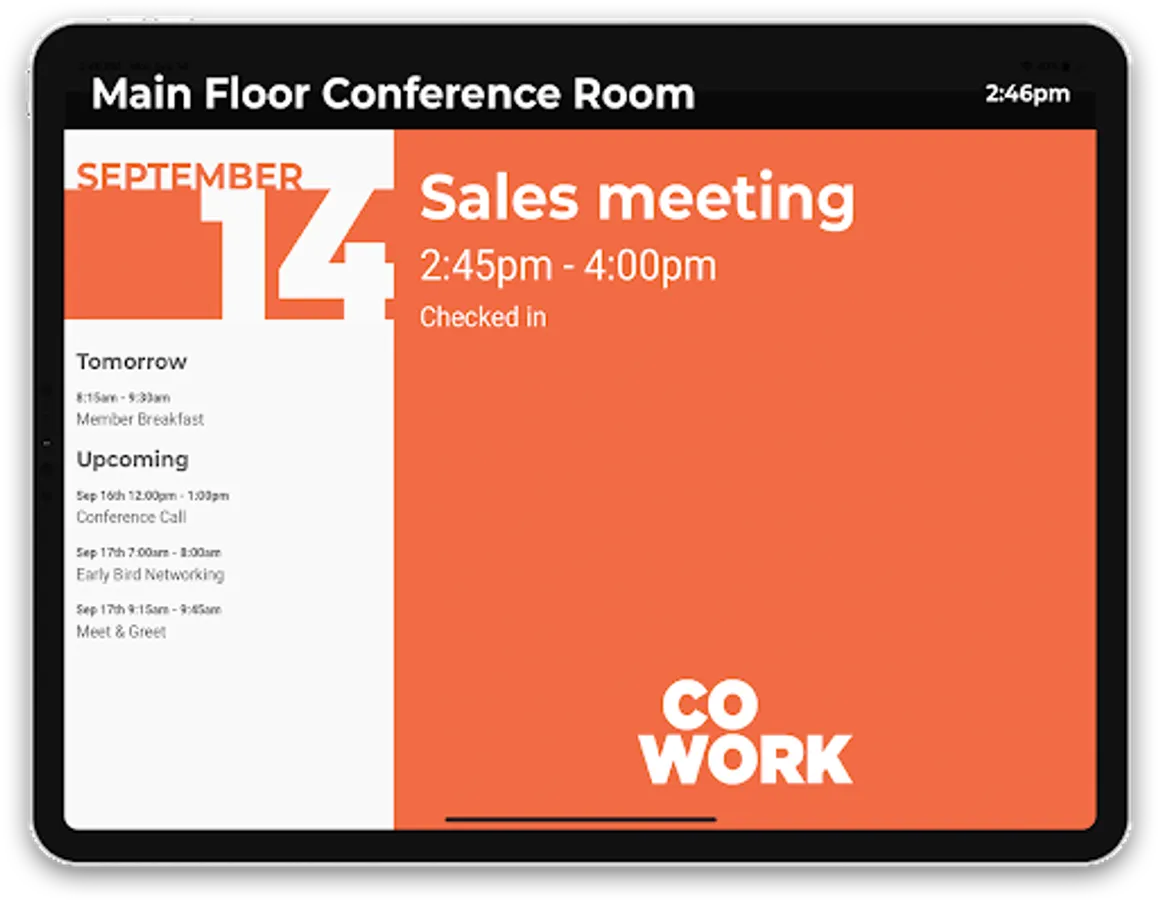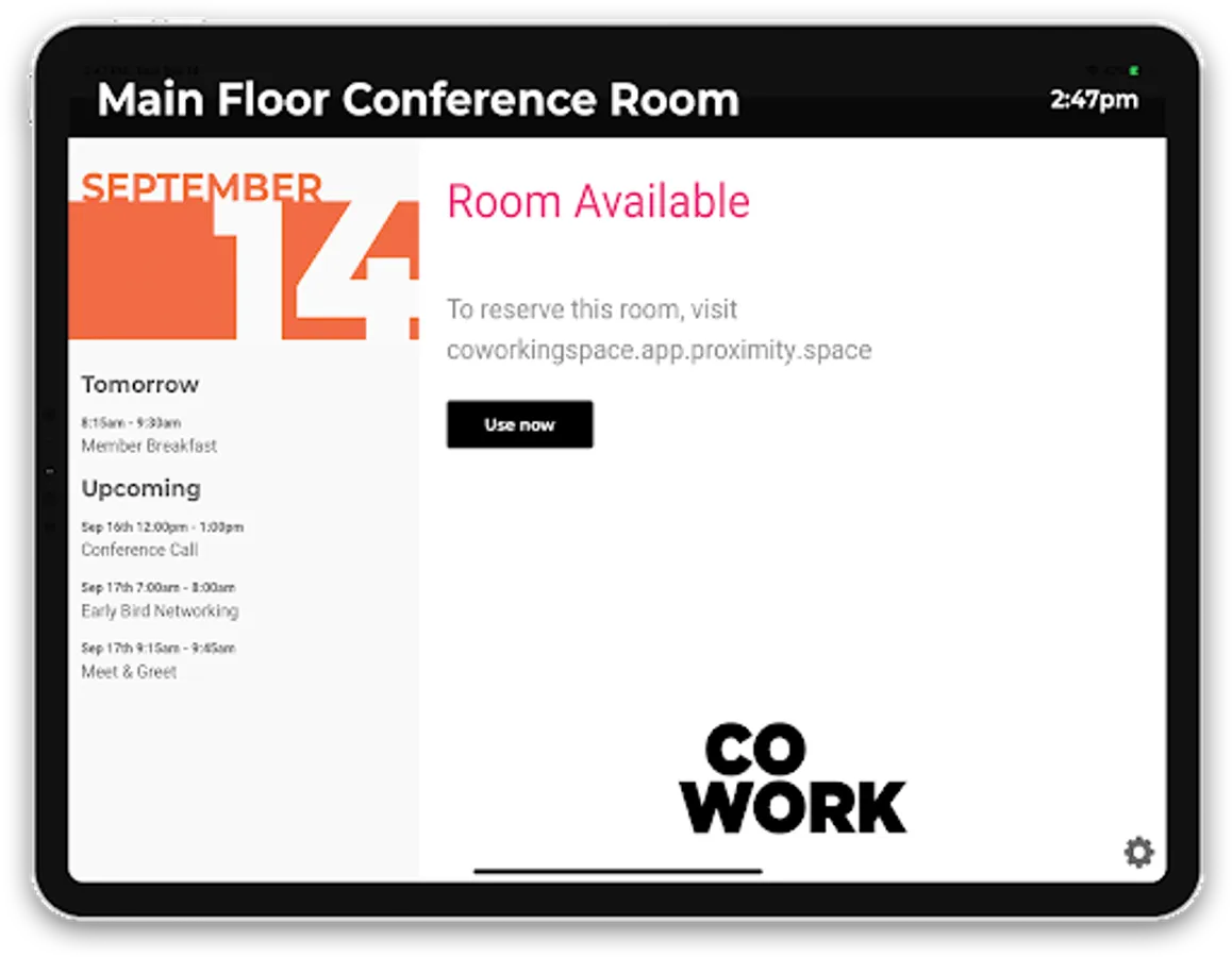 Your reservations at a glance. With Proximity Room View, your members can easily see the availability of your reservable resources without even getting up from their desks. Mount a tablet equipped with Room View to the wall near your conference room or other resource and you're good to go.