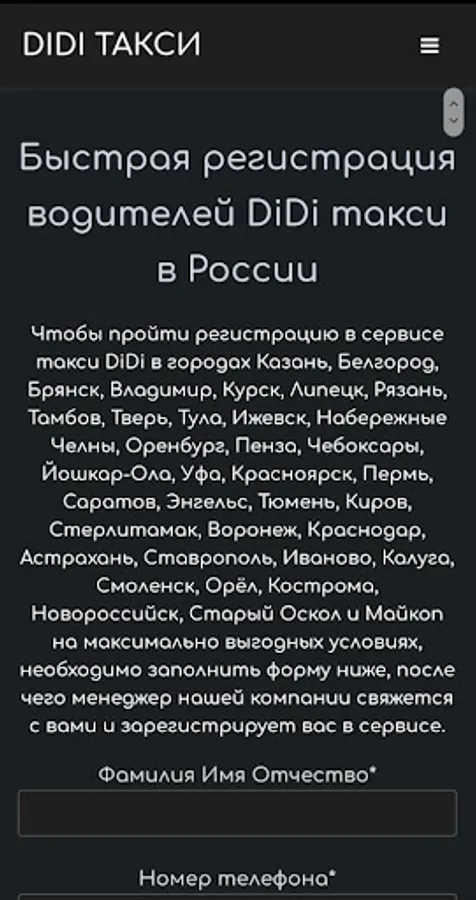 In March 2021. a recruitment of DiDi taxi drivers has started in the cities of Ufa, Krasnoyarsk, Perm, Saratov, Engels, Tyumen, Kirov, Sterlitamak, Voronezh, Krasnodar, Astrakhan, Stavropol, Ivanovo, Kaluga, Smolensk, Orel, Kostroma, Novorossiysk, Stary Oskol and Maykop.