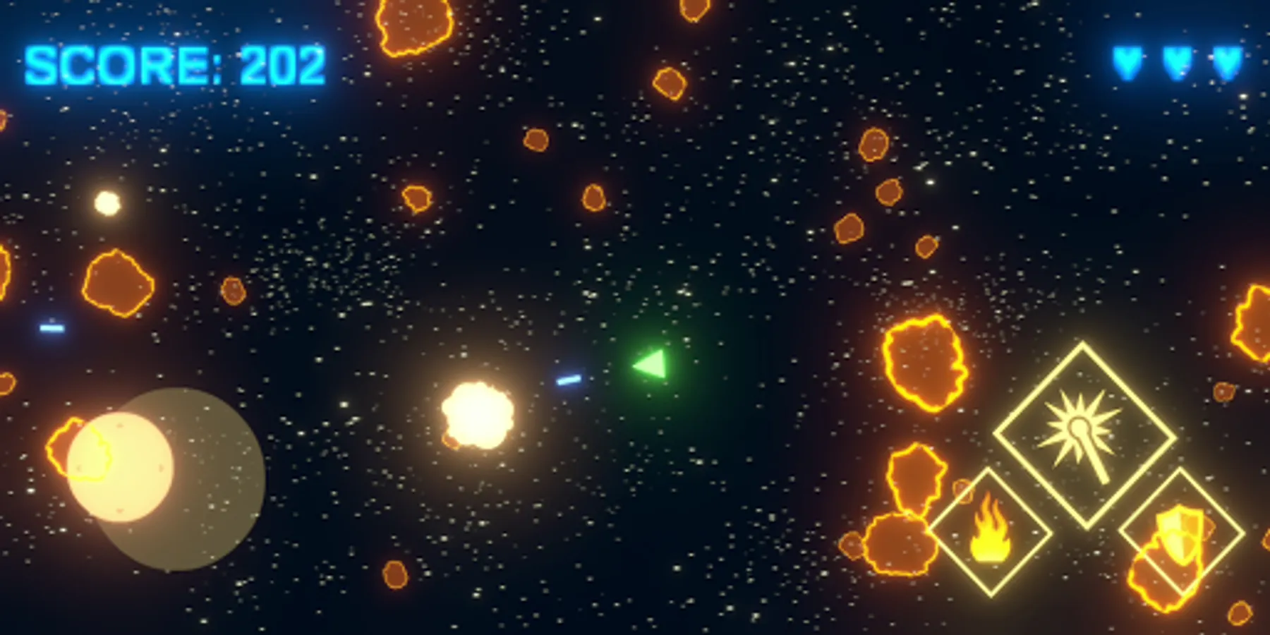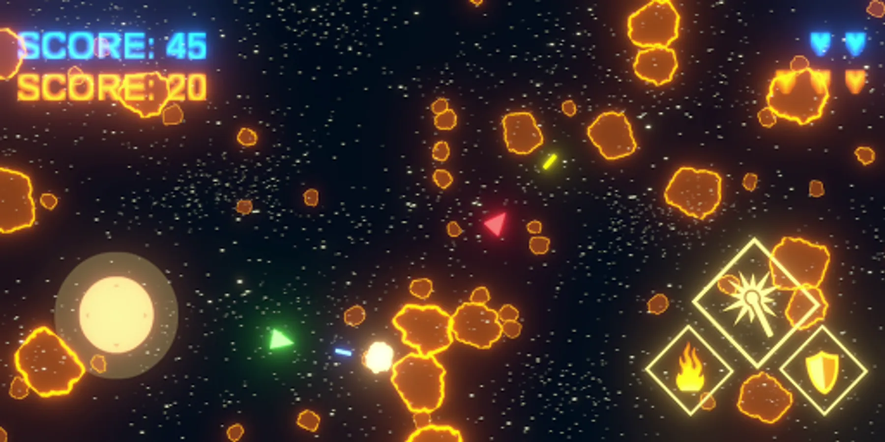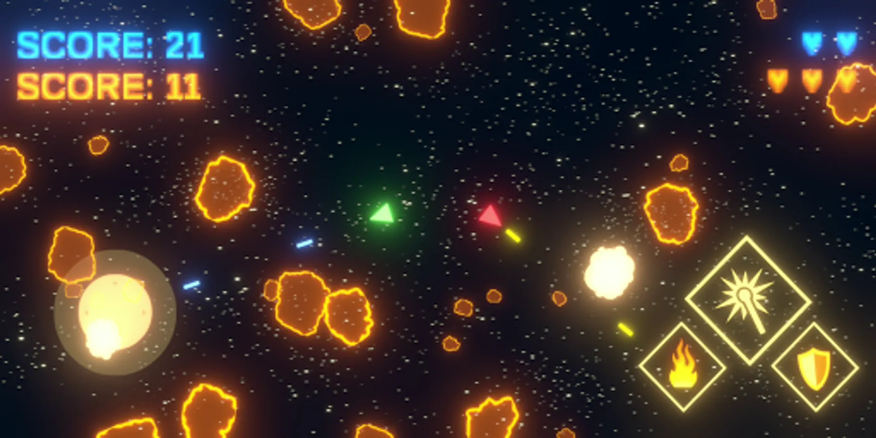 Play solo or together via LAN multiplayer in this glowing neon graphic style asteroids game.