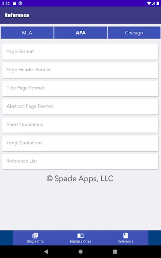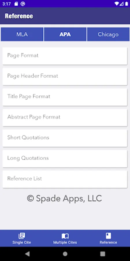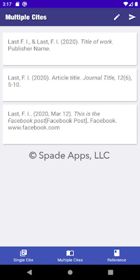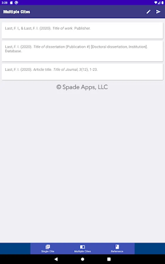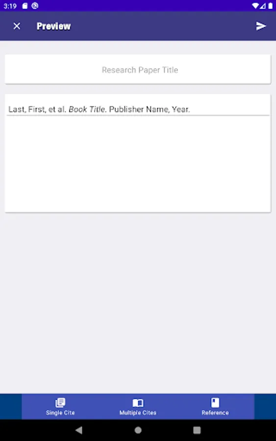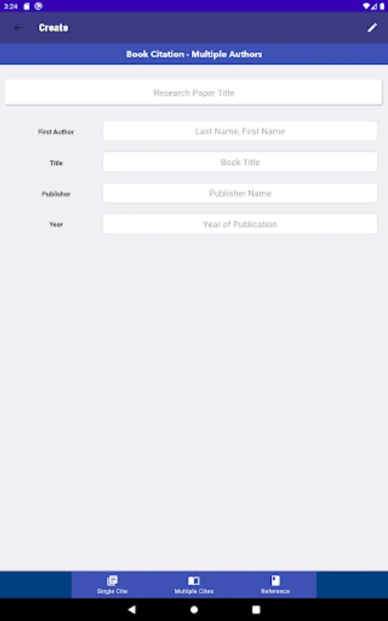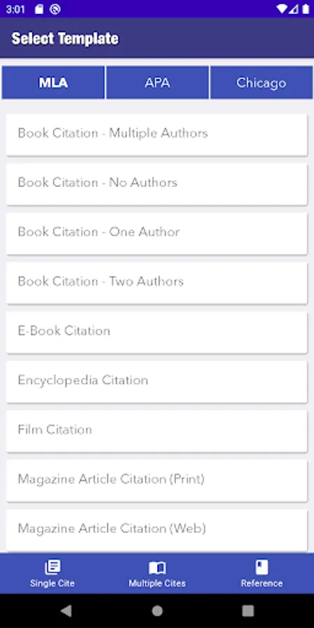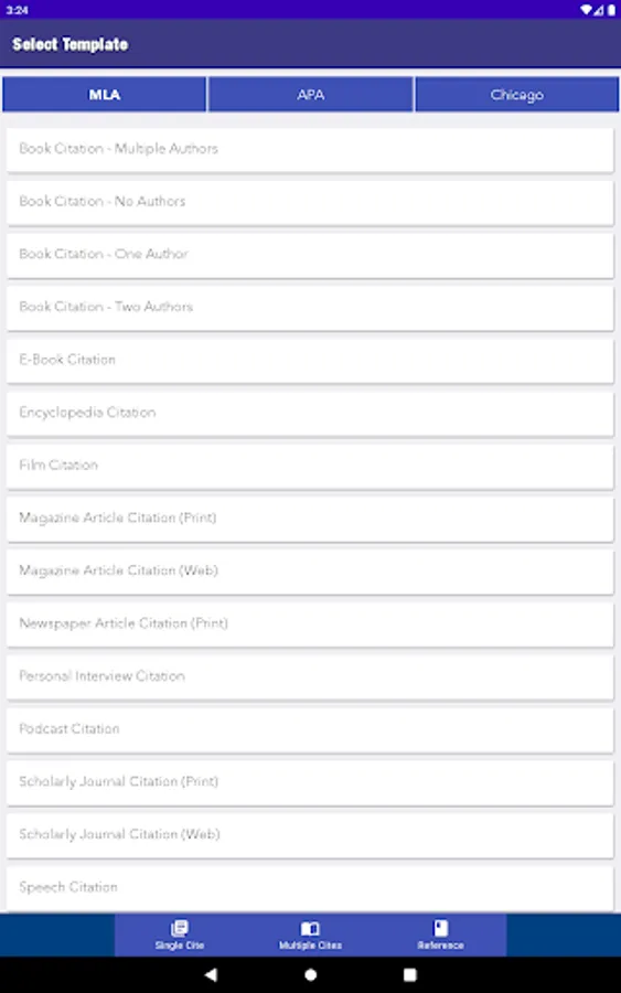 Cited is the easiest citation creation app. Simply select your paper format and your template, enter the information, and press create. Now with a section to create and save multiple citations.