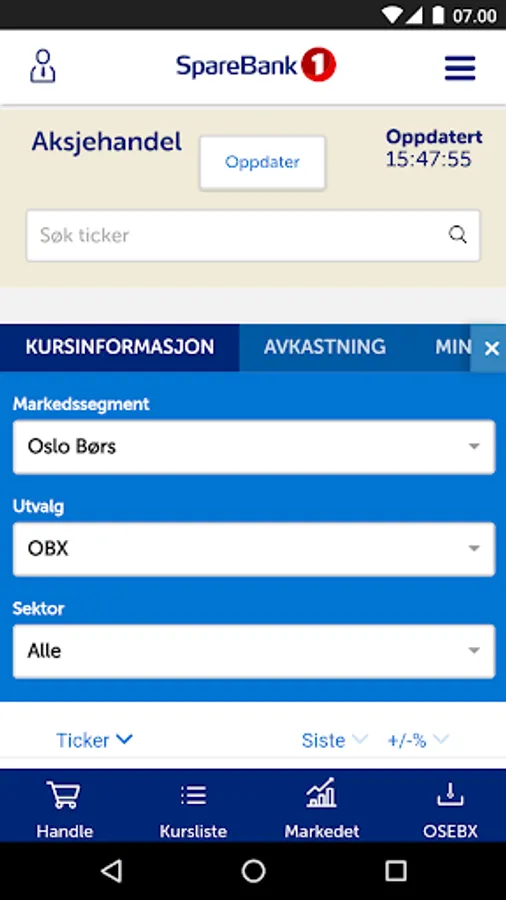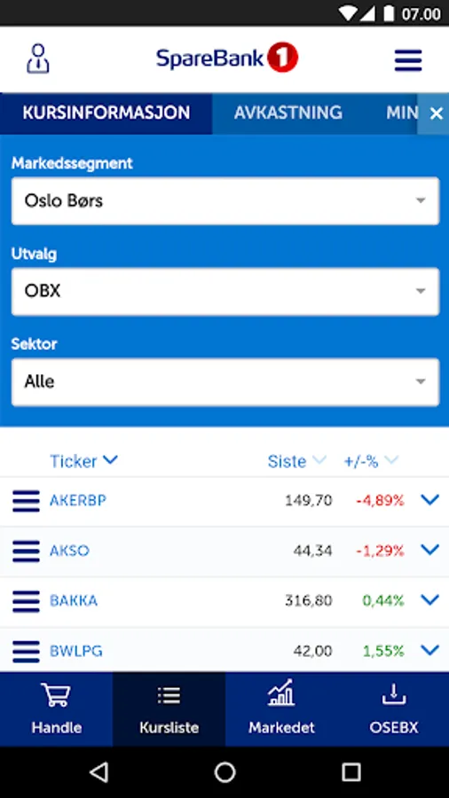 Stock from SpareBank 1 gives you easy access from your mobile device to the Norwegian stock market. You will be able to follow price developments in the Norwegian listed shares (streaming prices), read news, trade stocks, manage your stock portfolio and order book.