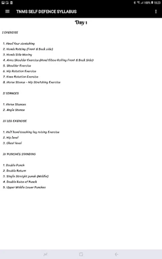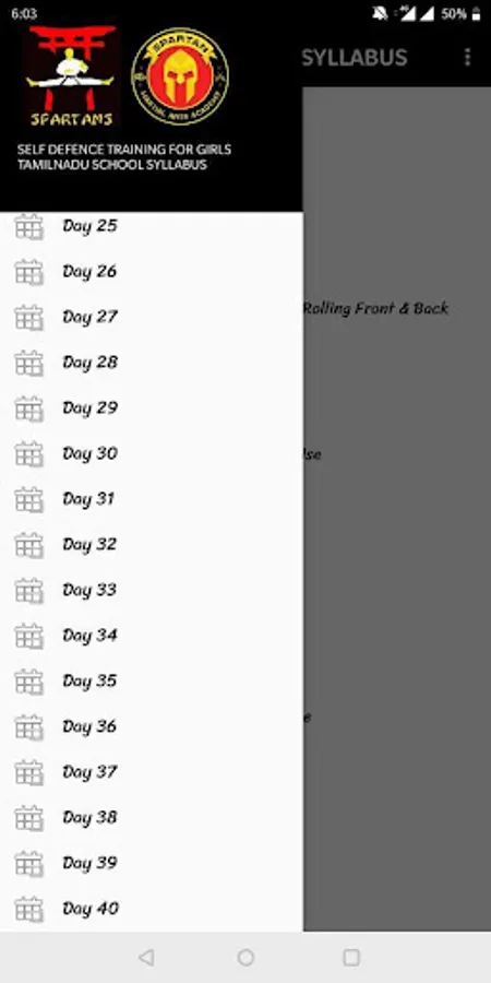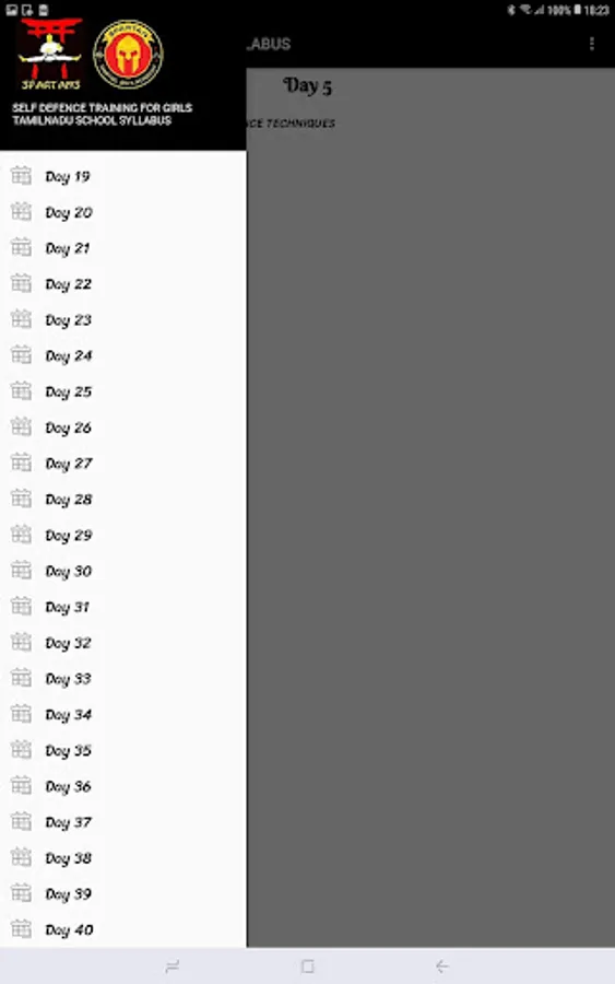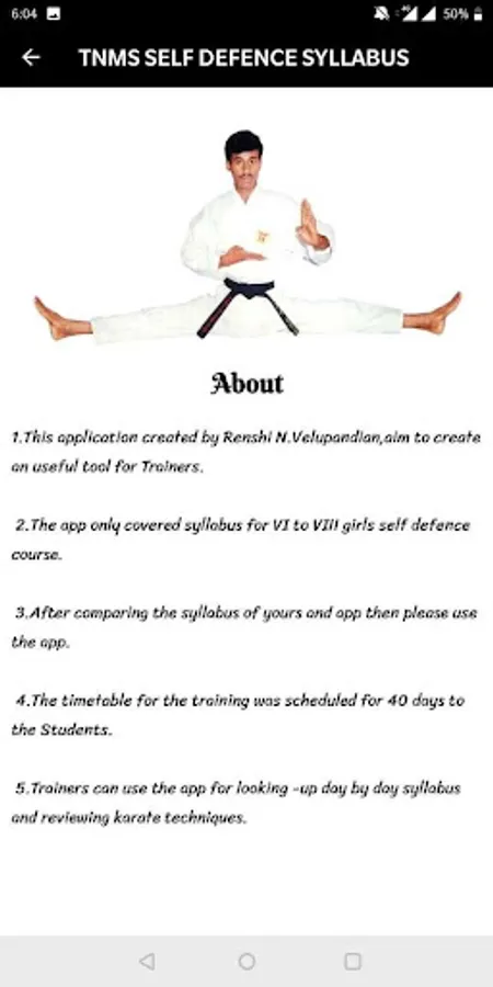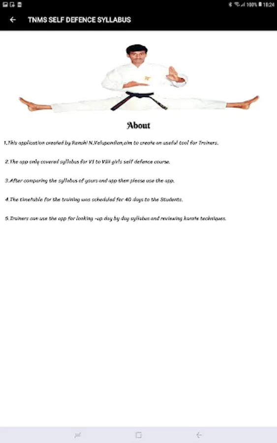 The app only covered syllabus for VI to VIII girls self defence course .After comparing the syllabus of yours and app then please use the app.The timetable for the training was scheduled for 40 days to the Students.Trainers can use the app for looking -up day by day syllabus and reviewing karate techniques.
