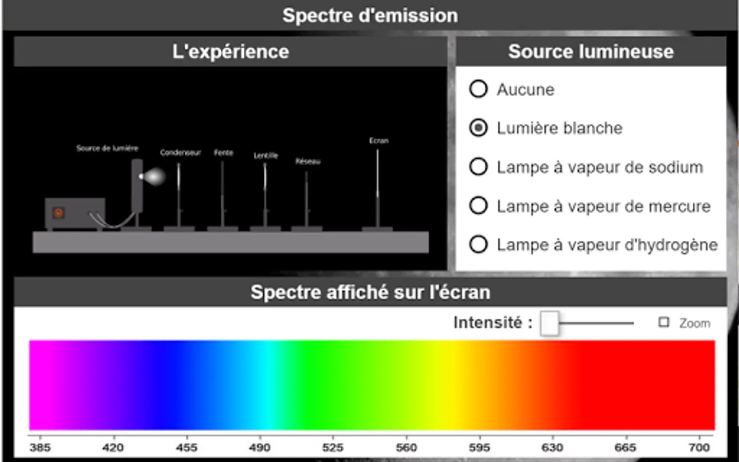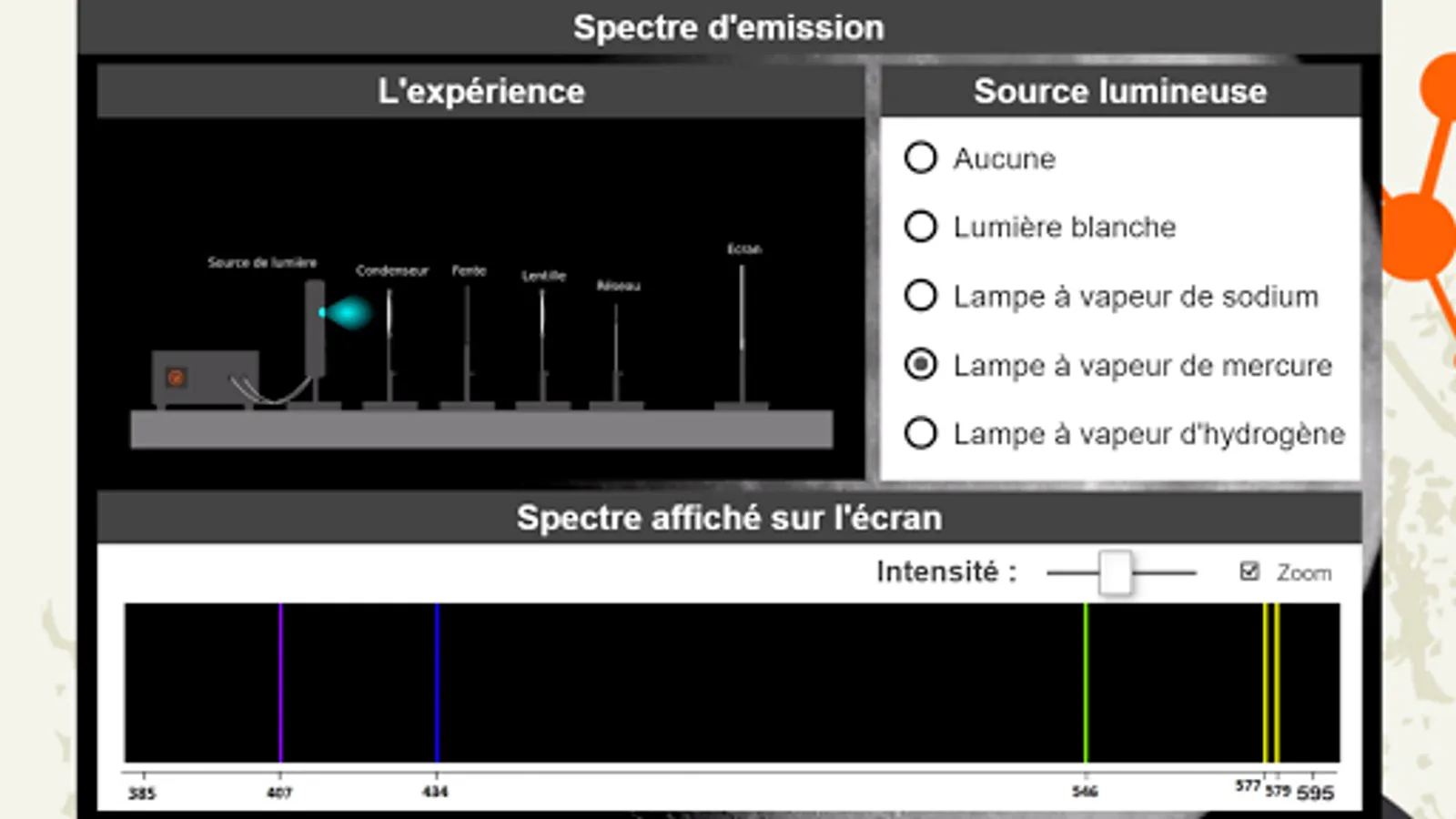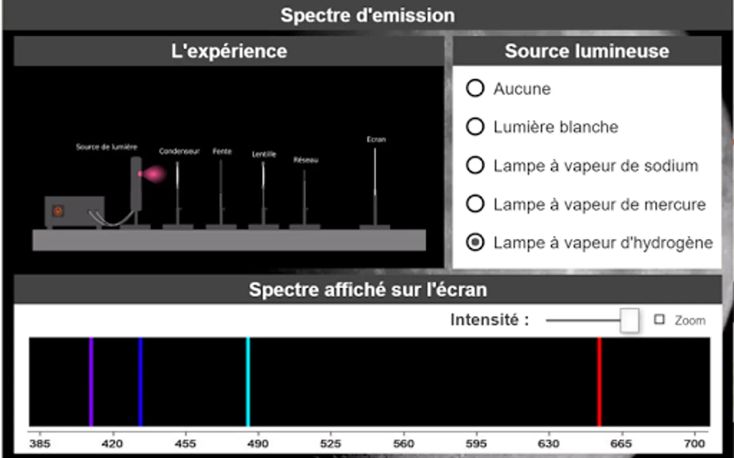 The animation emission spectrum makes it possible to observe the emission spectra of sodium, mercury, hydrogen, or to see the spectrum of white light.