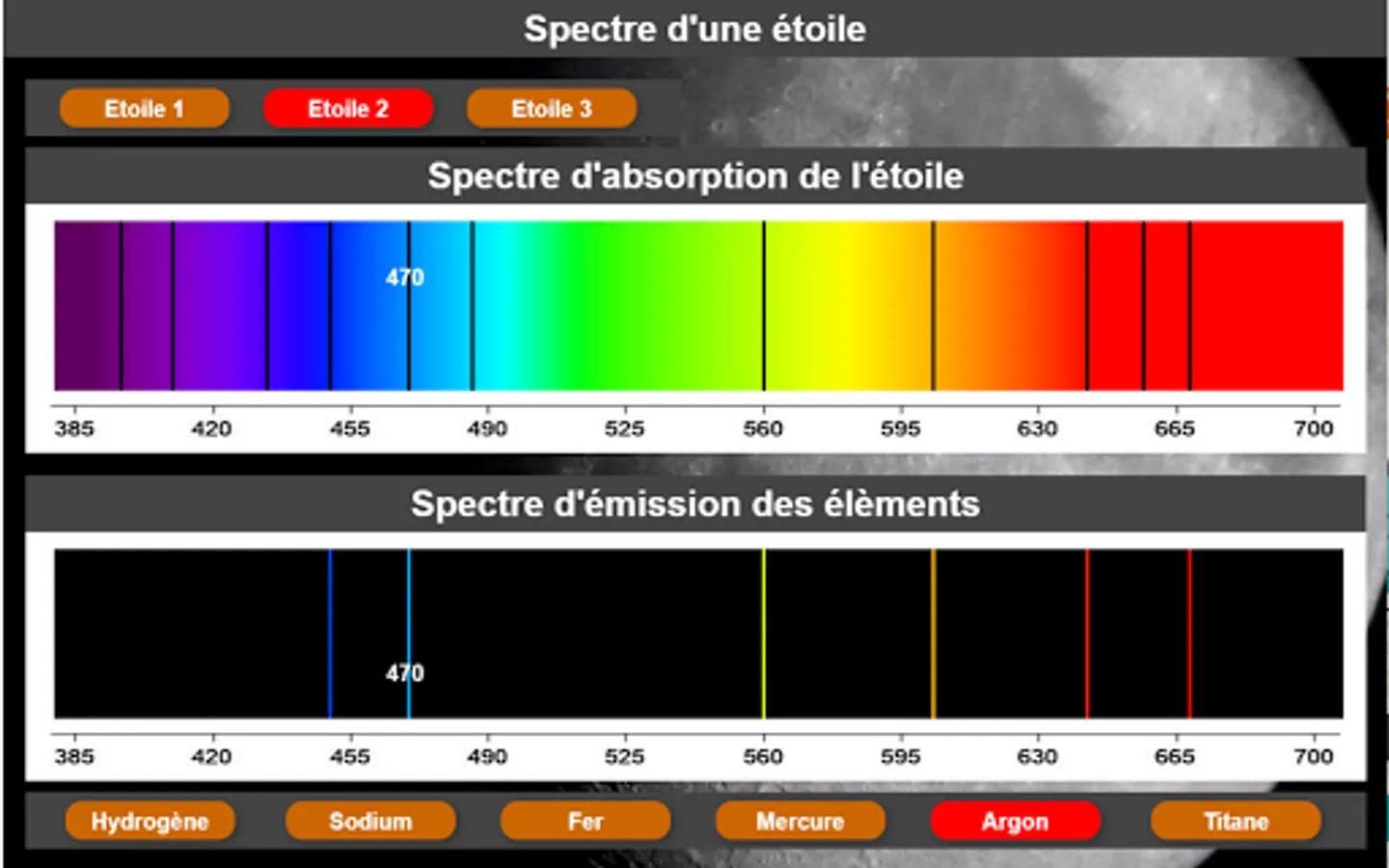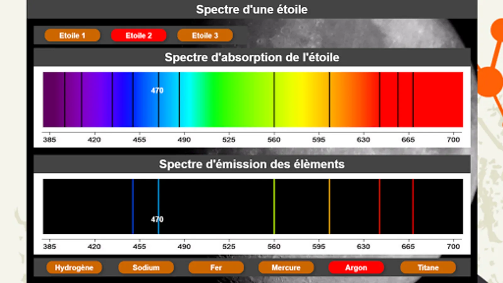The spectrum of application of a star is an animation as a "serious game" that examines the spectrum of three stars of absorption lines in order to know the composition of their atmosphere. By clicking on the spokes you can bring up the wavelengths.