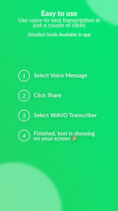 Our app is perfect for anyone who needs to transcribe their WhatsApp voice messages or audio files quickly and accurately. Whether you're a student, professional, or just someone who wants to keep track of important conversations, WAVO is the perfect tool for you. With our powerful transcription capabilities and user-friendly interface, Transcriber for WhatsApp is an excellent tool that simplifies the process of transcribing audio files and voice messages on WhatsApp.