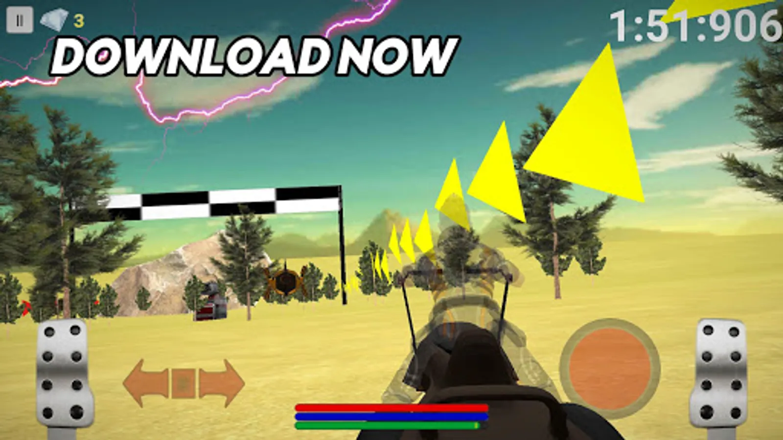 Race your hovercraft bike through various terrains and climates on point-to-point race tracks while avoiding trees and boulders.