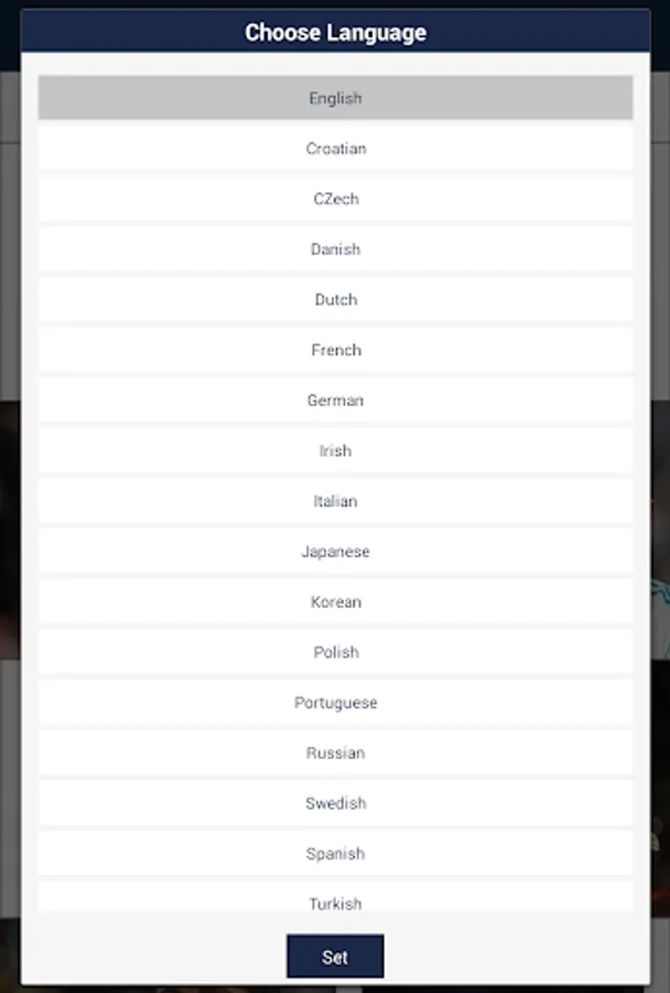 - App includes various languages to select, available languages are Croatian , Czech , Danish ,Dutch , French , German, Irish , Italian, Japanese, Korean, Polish , Portuguese , Russian, Spanish, Swedish and Turkish
